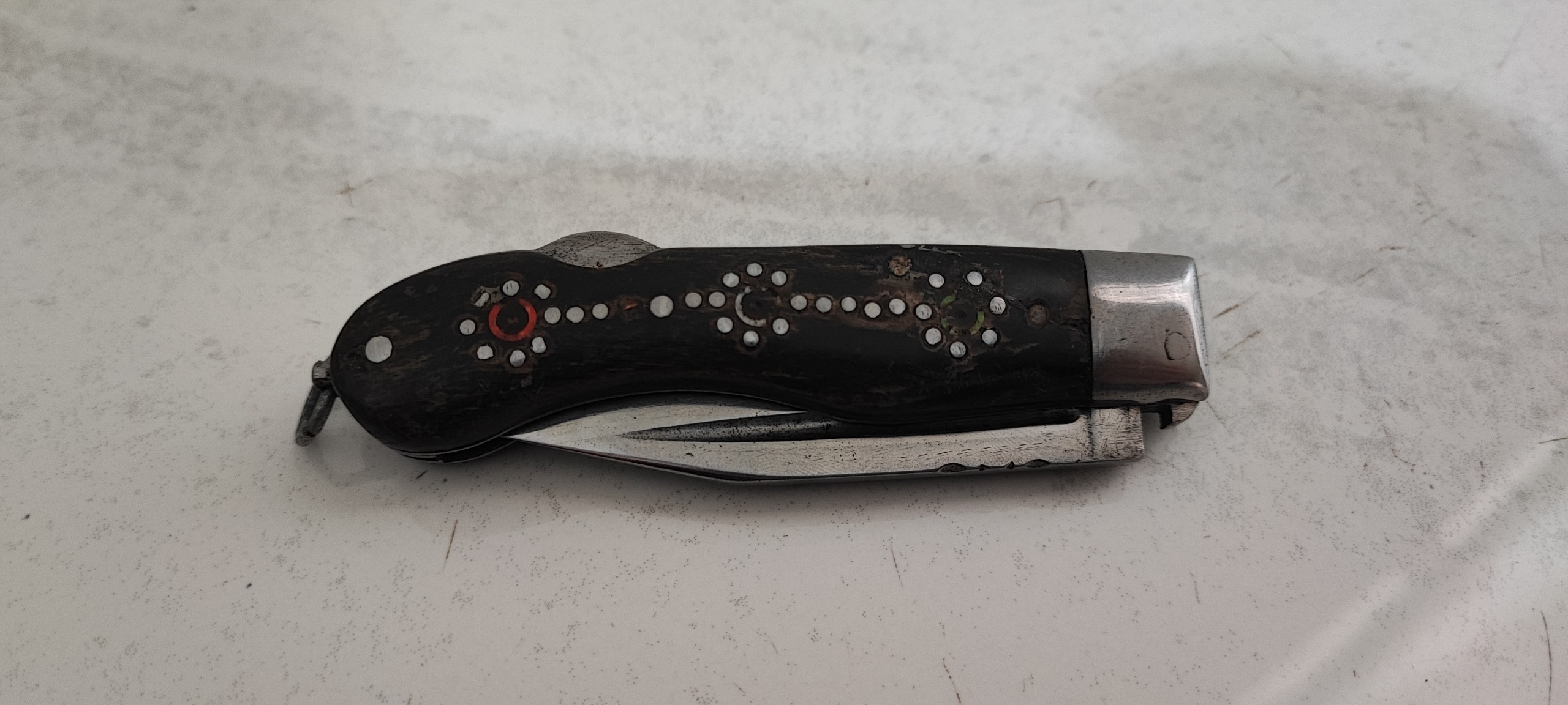 19 سانت طول، دسته شاخ و تیغ فولادی، ضامن محکم و بدون ایراد، اثری تمامً دستساز، بی نظیر و کمیاب، فقط حدود نیم سانت تیغه کوتاهتر شده
