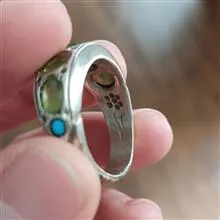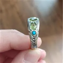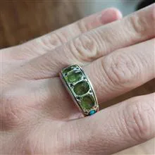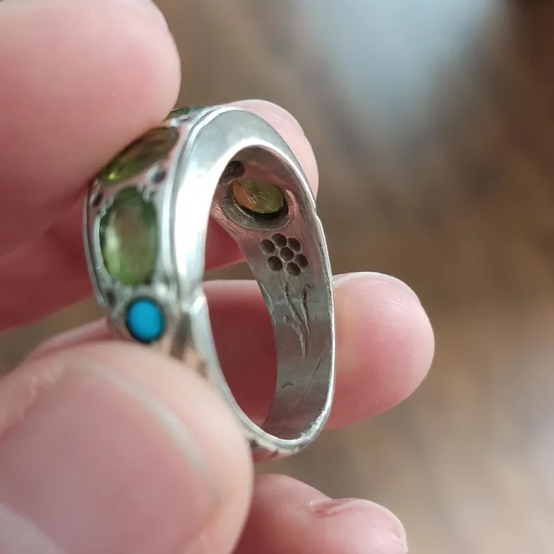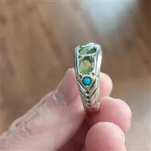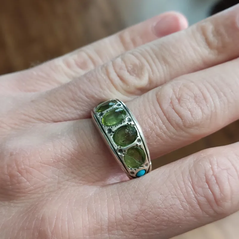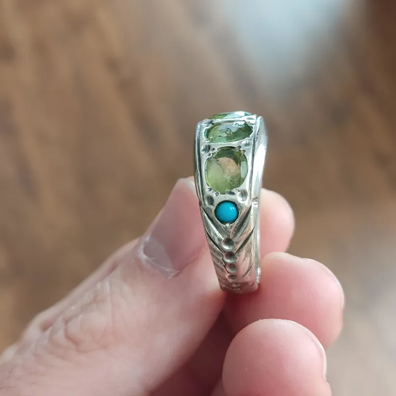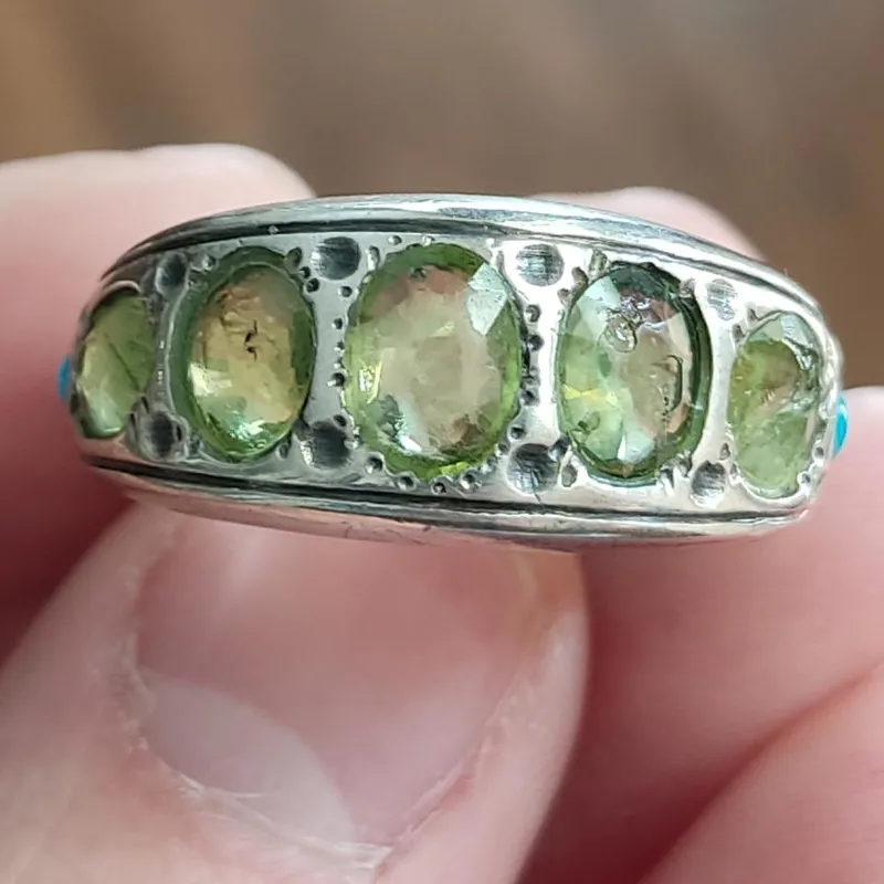 5 نگین زبرجد طبیعی به همراه دو فیروزه مخراج شده در رکاب
