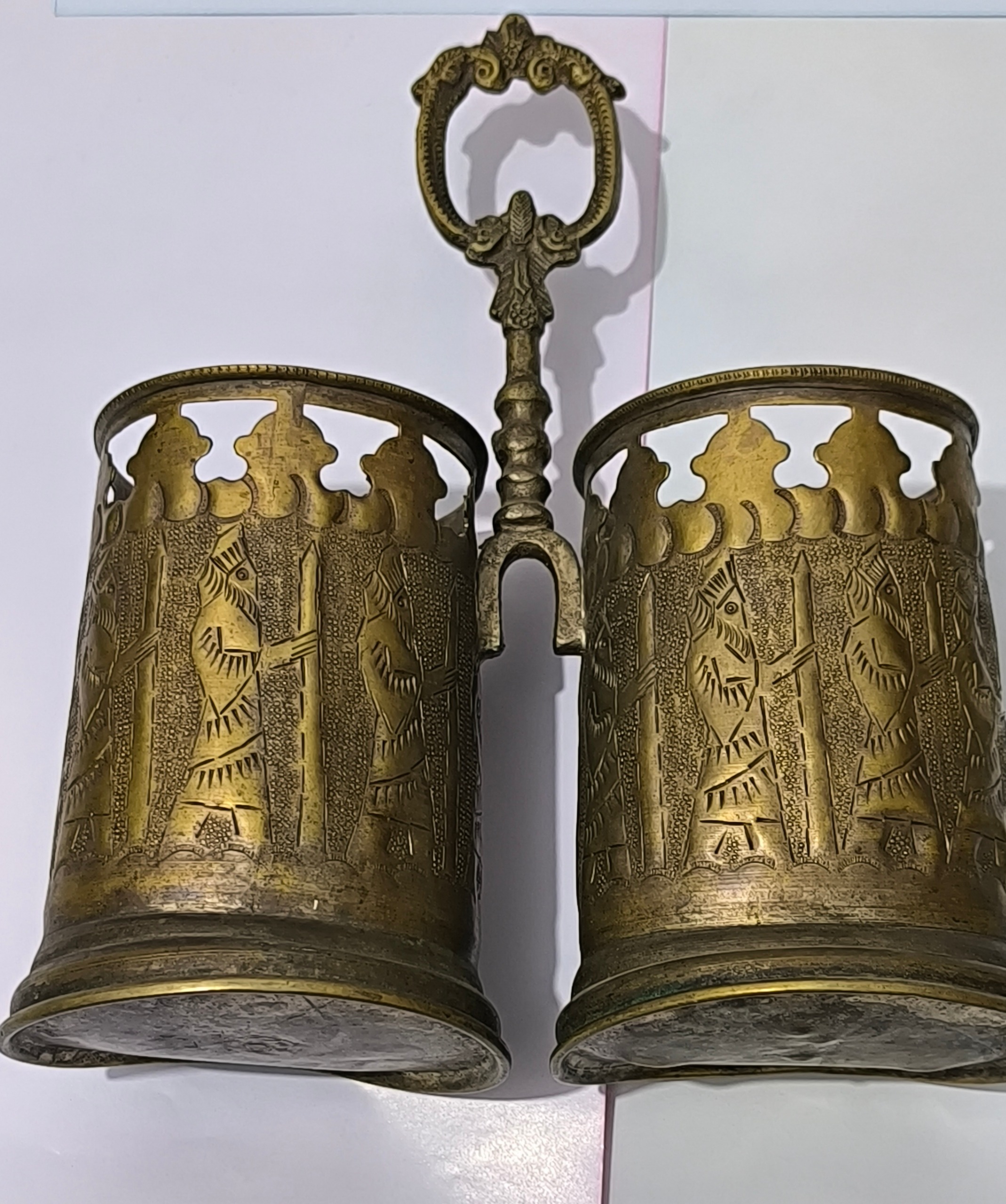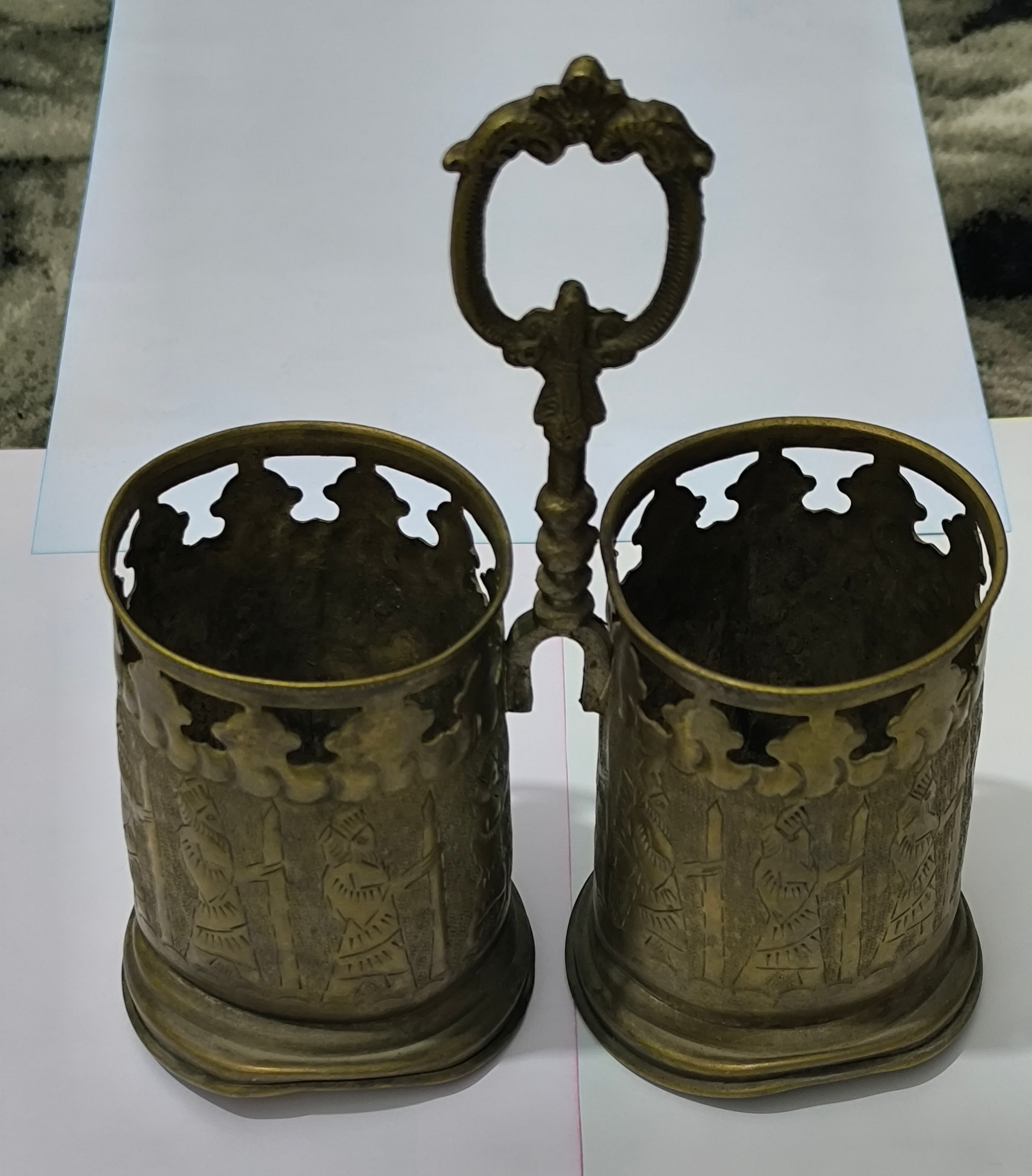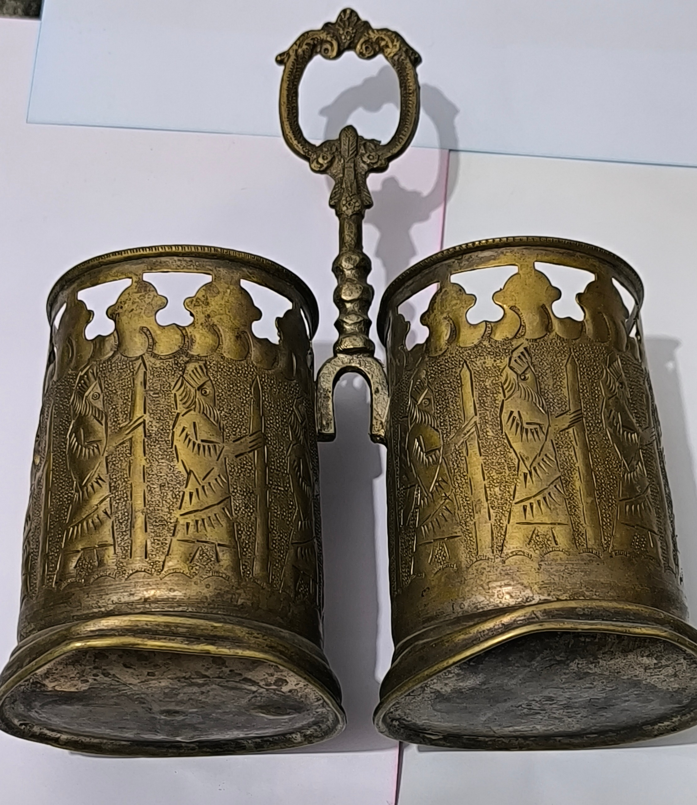 جای قاشق و چنگال خیلی قدیمی از جنس برنج یا برنز دقیق نمیدونم با طرح سرباز هخامنشی کف کار یکم قری داره ولی طرح کلی کاملا مشخص و سالمه به نظر میخوره برای زمان رضا شاه پهلوی باشه یا عقب تر دقیقا نمیدونم ولی از زمان پدر بزرگ من بوده مال جوانی هاش بوده تازه اونم مال صاحب خانه خودش بوده اون معلوم نیست تازه خریده بوده یا نه دیگه باقیش خودتون از رو عکس انتخاب کنید چون واقعا اطلاعات دقیق تری ندارم