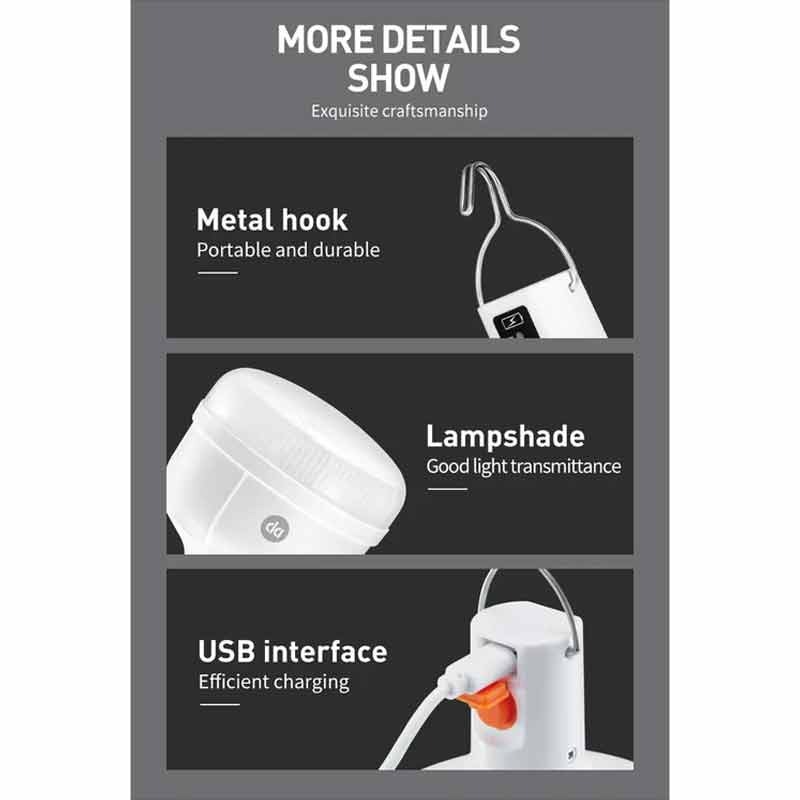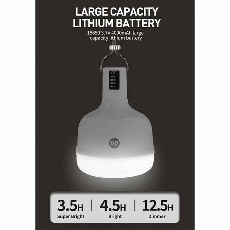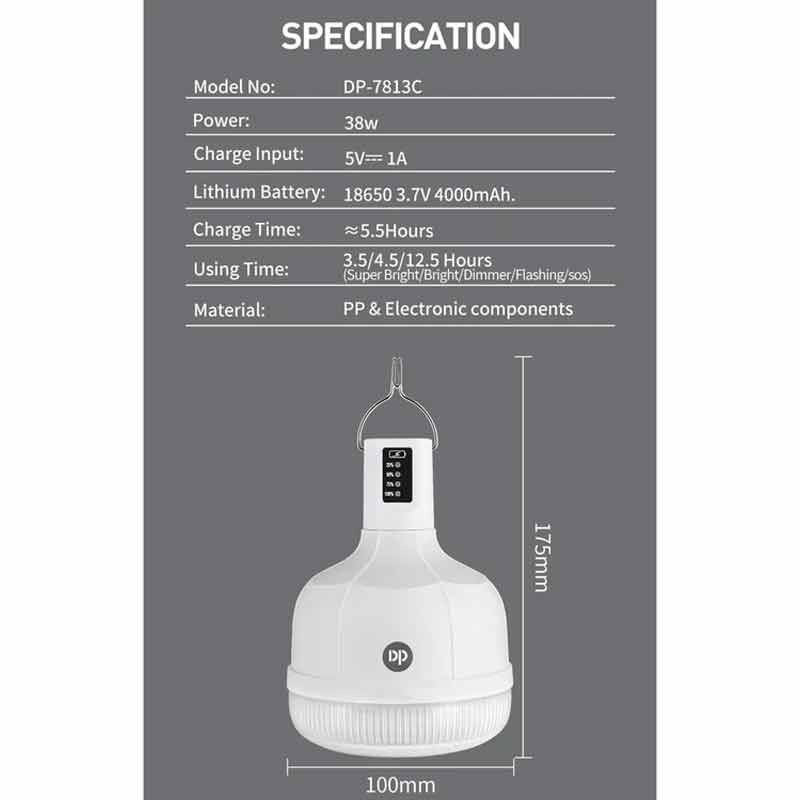 توان چراغ آویز چادر دی پی مدل DP-7813C 38 وات است. و دارای یک باتری قوی لیتیومی با ظرفیت 4000 میلی آمپر ساعت میباشد. این لامپ با استفاده از کابل تایپ سی شارژ میشود. و مقدار شارژ بر روی بدنه آن مشخص است. از ویژگیهای قابل توجه این چراغ میتوان به ضد آب بودن آن اشاره کرد. این چراغ دارای سه شدت نور متفاوت و دو حالت چشمک زن است. که میتوانید با هر بار فشردن دکمه حالت را تعیین کنید. هر بار شارژ کامل این چراغ حدود پنج و نیم ساعت طول میکشد با هر بار شارژ کامل میتوانید از آن حدود 12 ساعت در حالت کم نور و سه و نیم ساعت در حالت بسیار پرنور استفاده کنید. همچنین در بالای این چراغ یک قلاب تعبیه شده که برای آویزان کردن چراغ میتوانید از قلاب استفاده کنید.