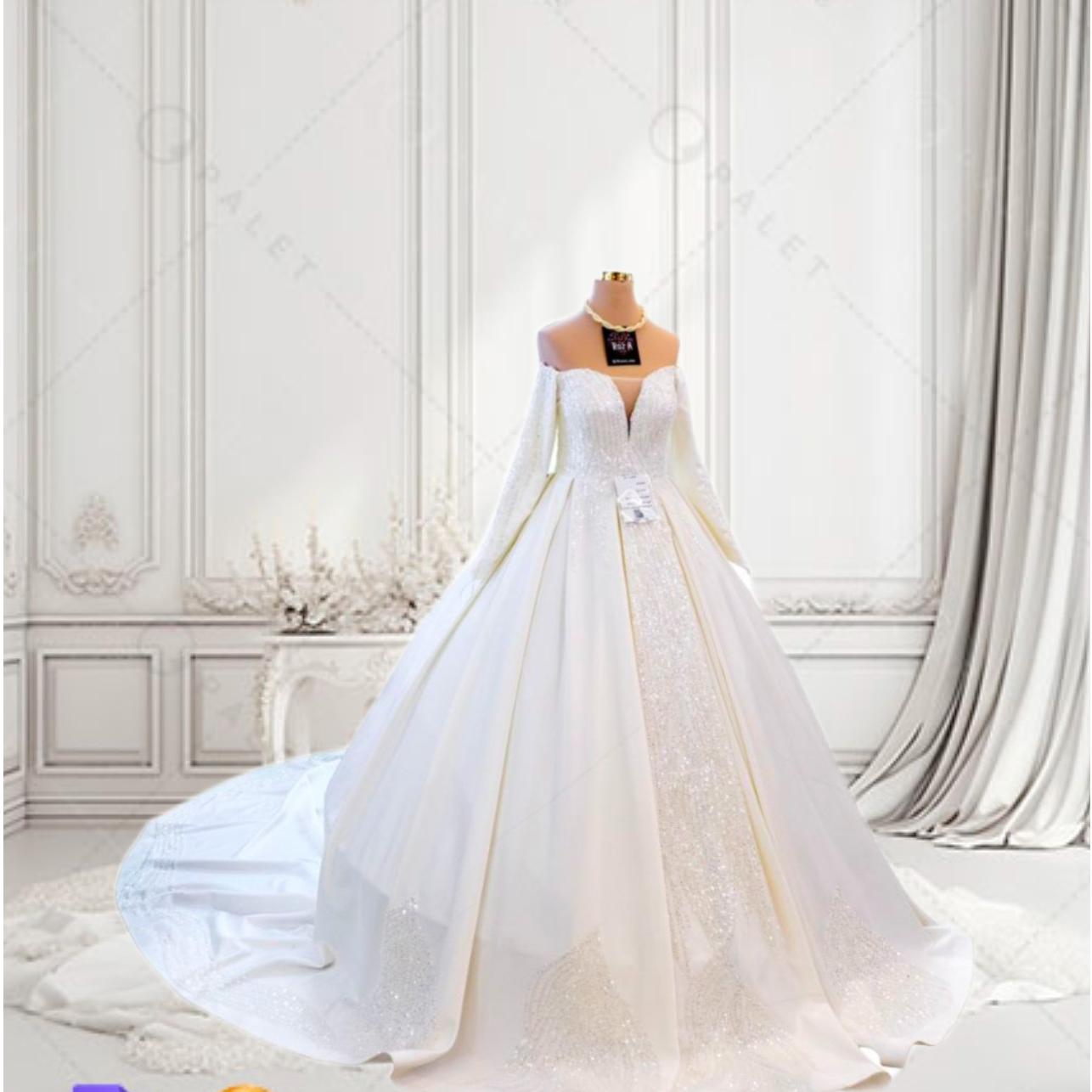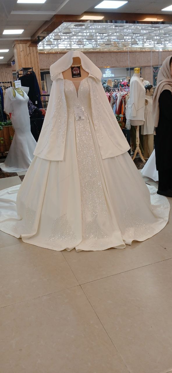 لباس عروس دنباله دار با طراحی باشکوه و پارچه ی فاخر ساتن آمریکایی، همراه با کریستالدوزی های ظریف و دستدوز که درخشش بینظیری به هر حرکت شما میبخشد.