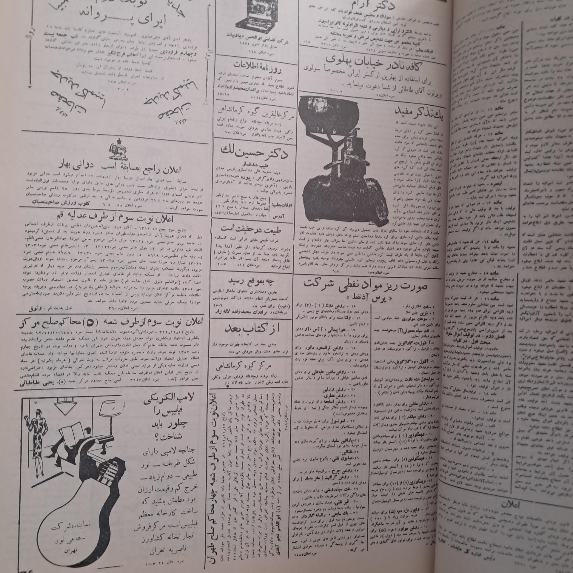 شامل کلیه اخبار روز جهان در سال 1313 و تبلیغات فروش کلیه وسایل و مواد و فروشگاهها و... در ان زمان.سال های دیگر نیز موجود است که بسته به تاریخ قیمت متفاوت است.از 1313 تا 1329.و سال 1359