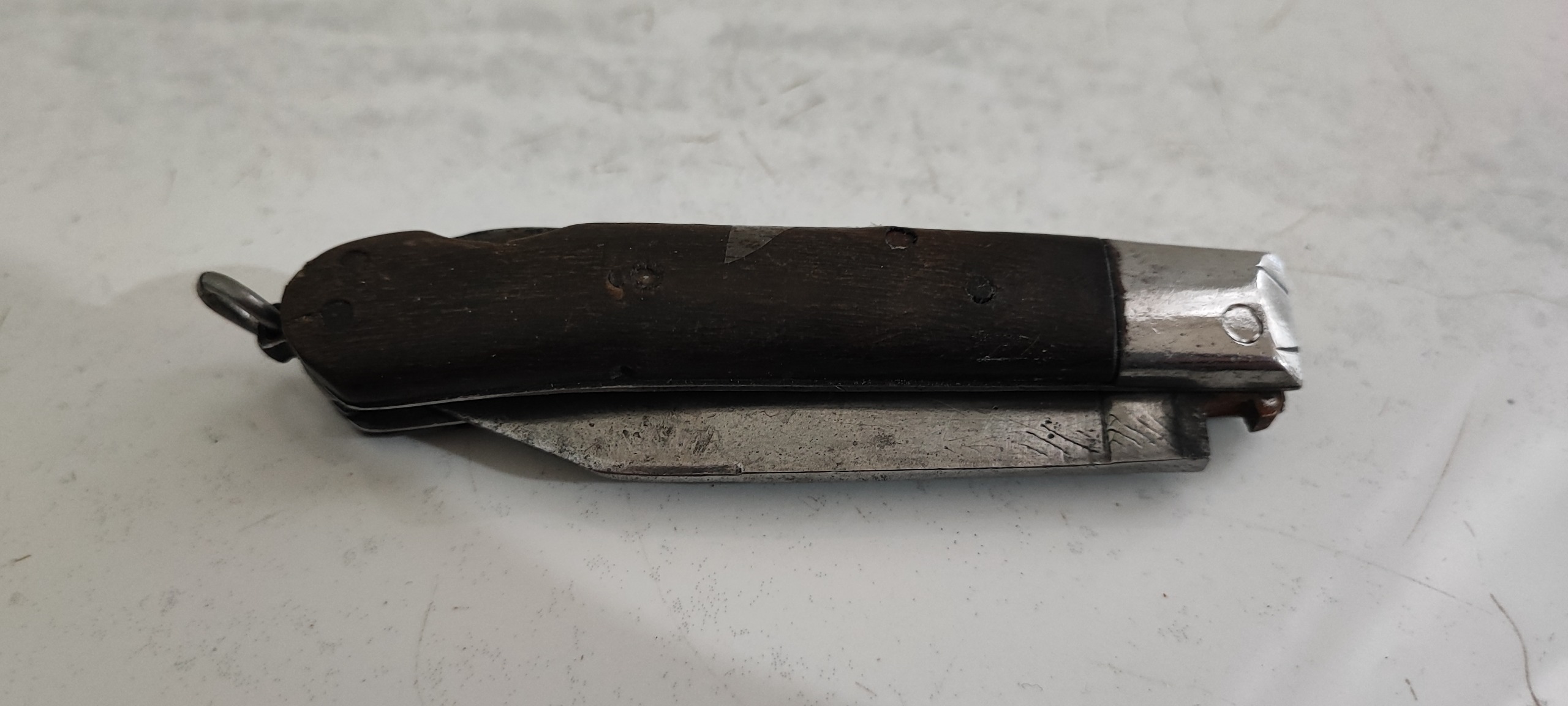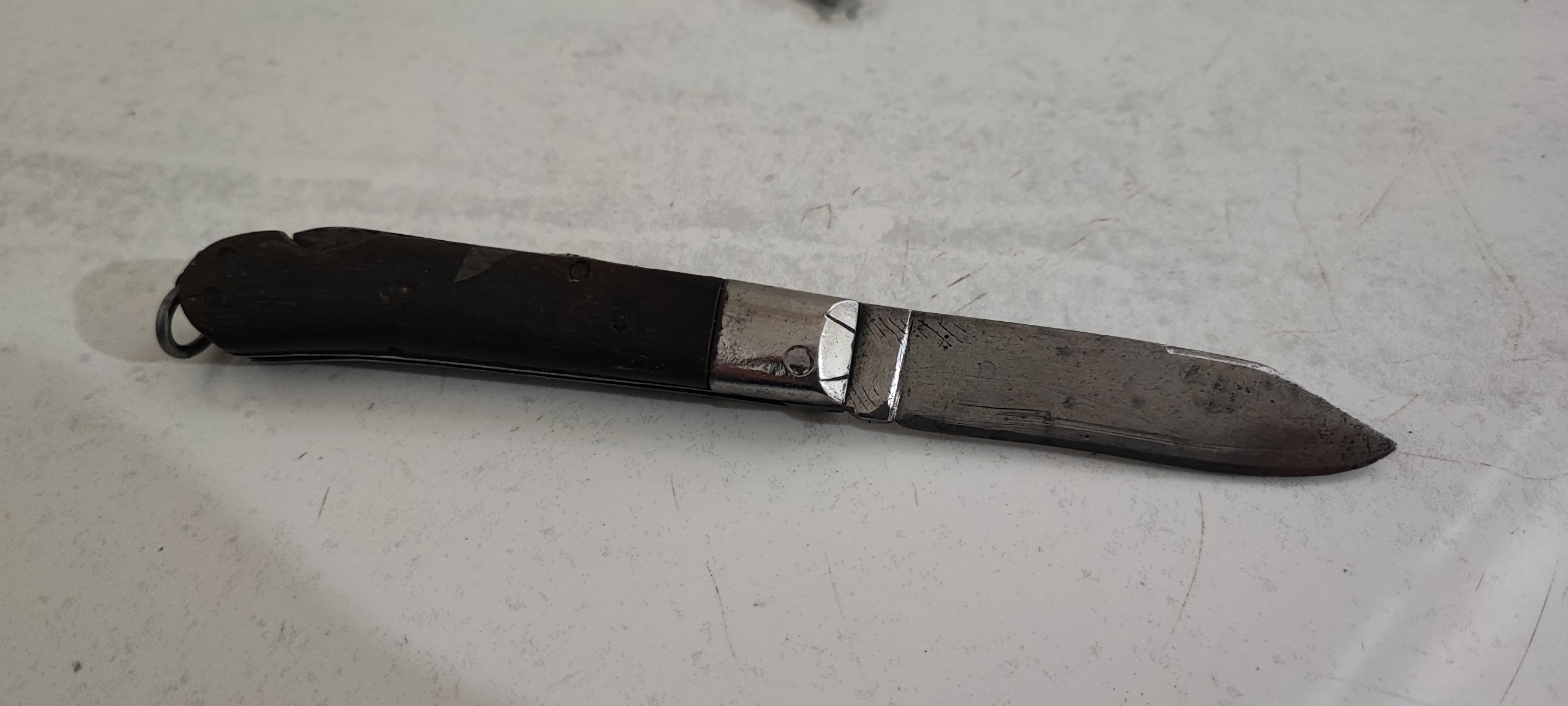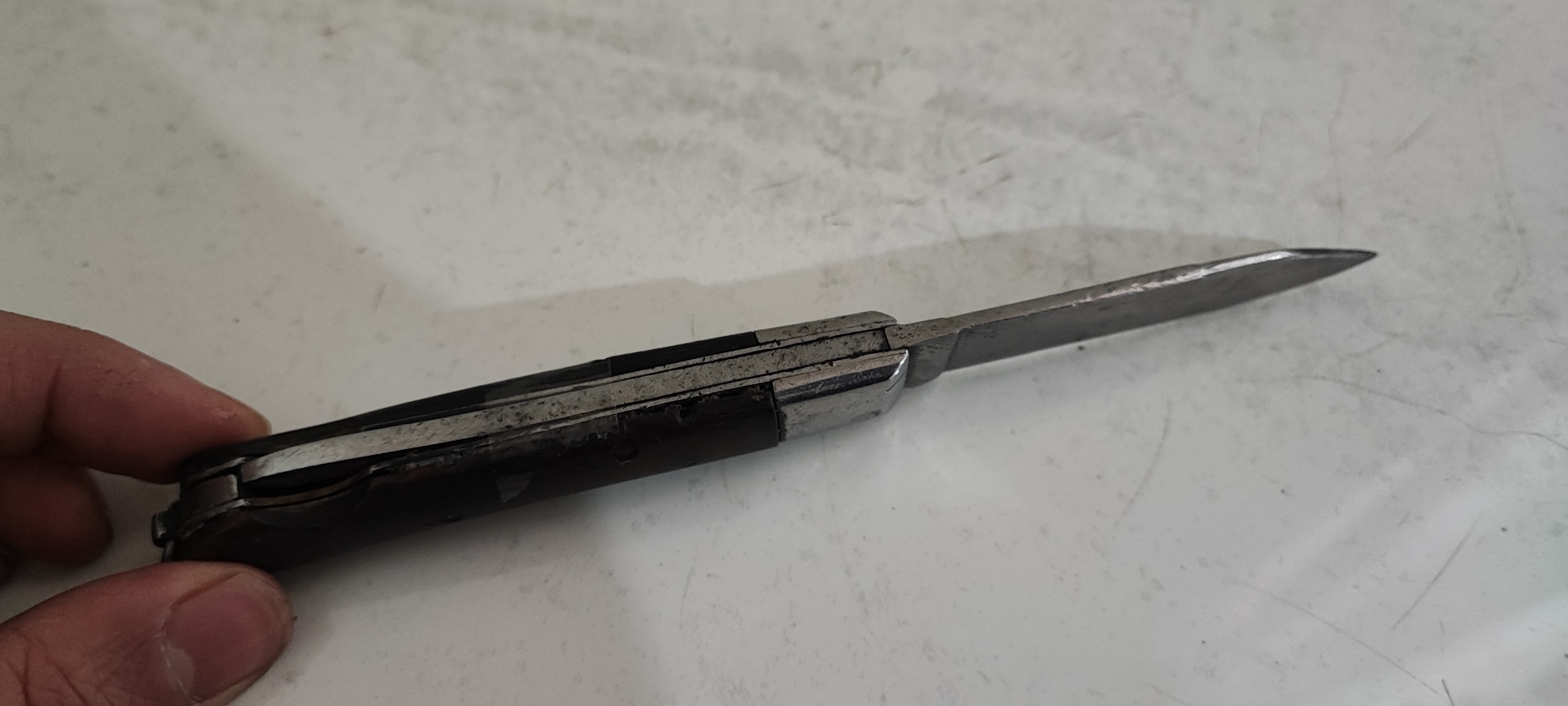 19 سانت طول، تیغ فولادی و دسته شاخ، اندک لقی داره، حدود یک سانت تیغه کوتاهتر شده، به احتمال زیاد کار خود استاد بابای مرحوم، نفیس و کلکسیونی