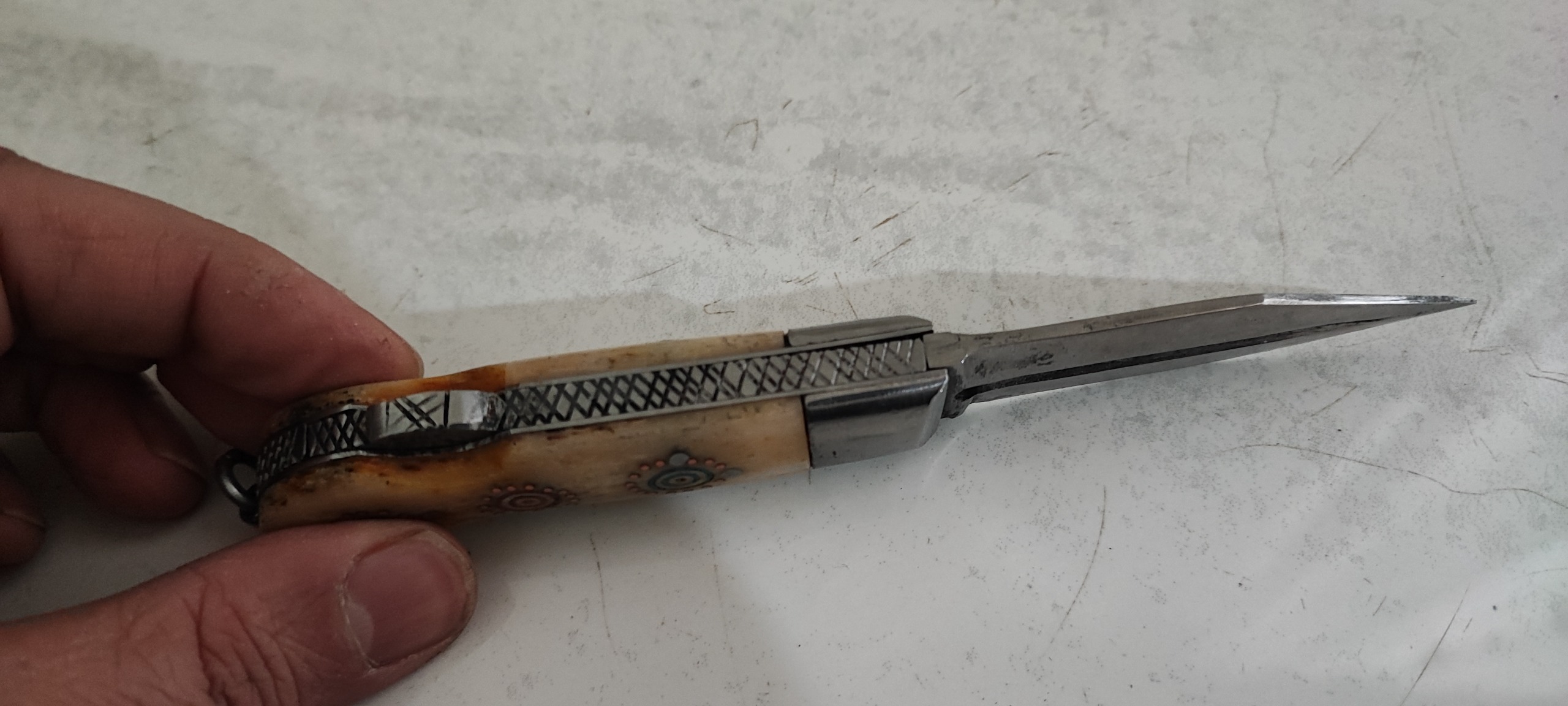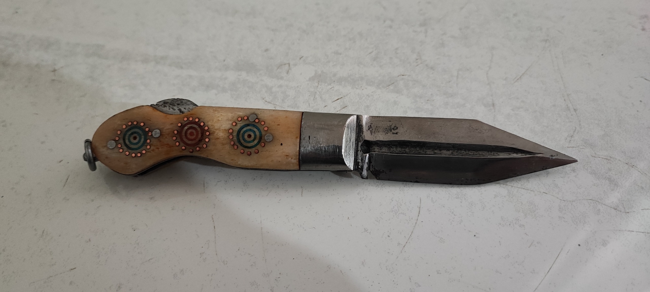 17 سانت طول، تیغ فولادی و ساخته شده از سرنیزه و دسته استخوان، قدیمی و ساخت سفارشی، بکر و محکم و بدون ایراد
