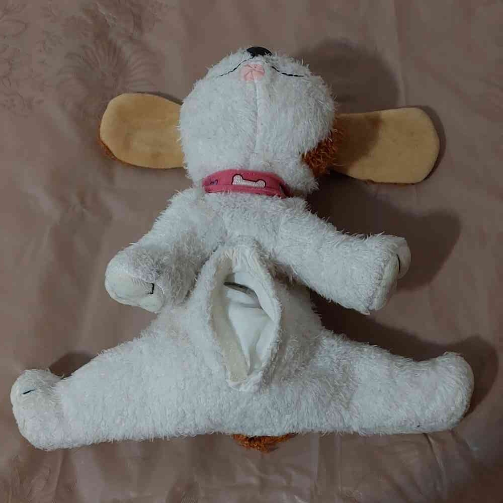 ویژگی : در قسمت شکم یک جیب چسبی دارد که میتوانید به دلخواه خودتان در آن سوت سوتک یا جغجغه یا دستگاه موزیکال قرار دهید , دارای گردنبند یا قلاده پارچه ای با طرح قلب و استخوان دور گردن جهت زیبایی ، چشم و دماغ پلاستیکی ، داخل دست و پا و شکم عروسک دونه های سفت قرار دارد , قابل شستشو , خارجی وارداتی