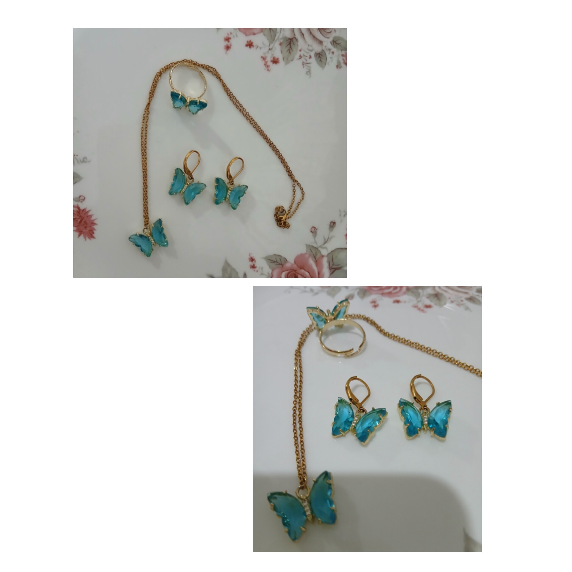 نیم ست شیک پروانه کریستالی خوشرنگ استیل فقط انگشتر استفاده شده وکمی رنگش رفته ومشخص هم نیست بقیه  همش تمیز وزیبا دارای گردنبند گوشواره وانگشتر شیک با قیمت عالی تقدیم میشود سوال وعکس بیشتر در خدمتم