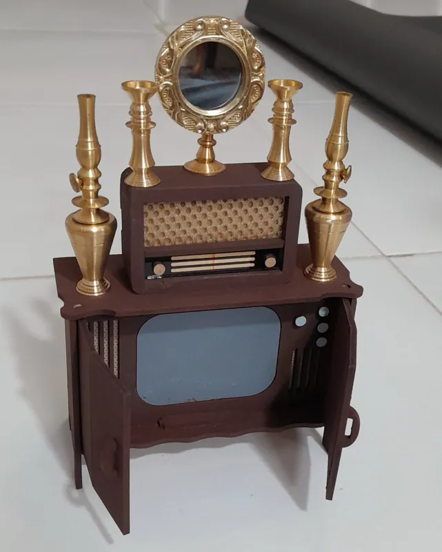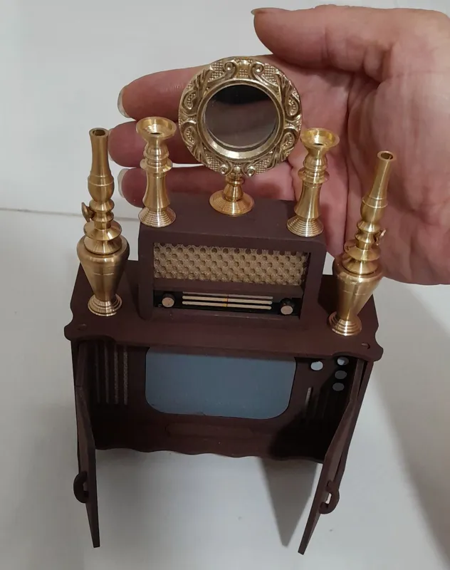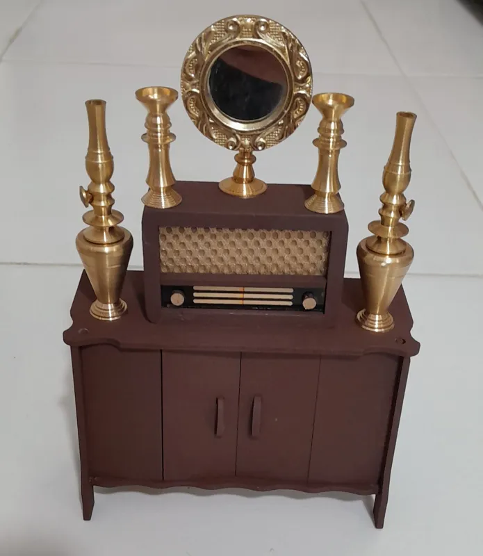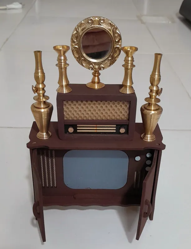 آینه شمعدان و گردسوزها برنجی میباشند و تلویزیون و رادیو چوبی. دربهای تلویزیون باز و بسته میشود.