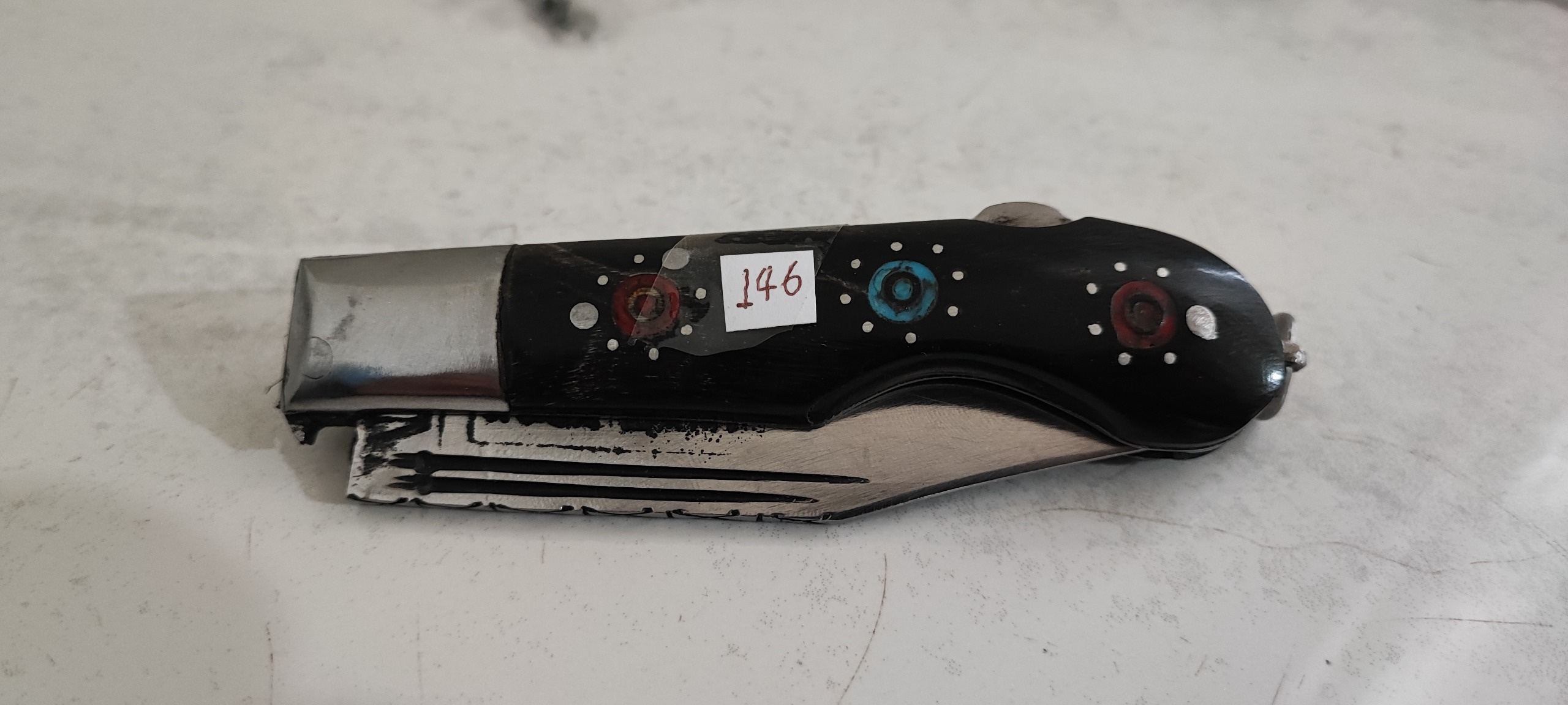 سایز بزرگ و 23/5 سانت طول، ساخت سفارشی، تیغ فولادی و ساخته شده از داس روسی و دسته شاخ، محکم و بکر و بدون ایراد، نایاب و کلکسیونی