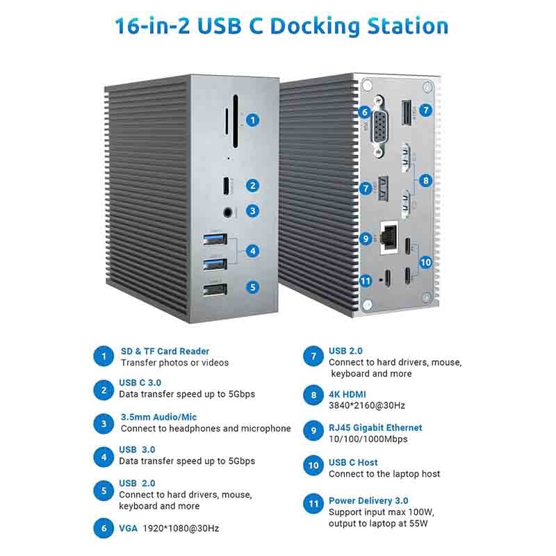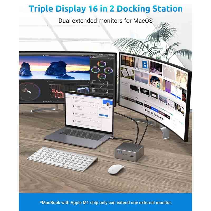 داک مک بوک QIYO 16 در 2: میتوان دستگاه را برای گسترش صفحه نمایش، انتقال و شارژ به آن متصل کرد. دو پورت HDMI با کیفیت 4K، یک پورت VGA، پاوربانک 55 واتی، پورت USB C 3.0، دو پورت USB 3.0، سه پورت USB 2.0، اترنت گیگابیت، دو پورت USB C، کارت خوان SD/TF، جک 3.5 میلی