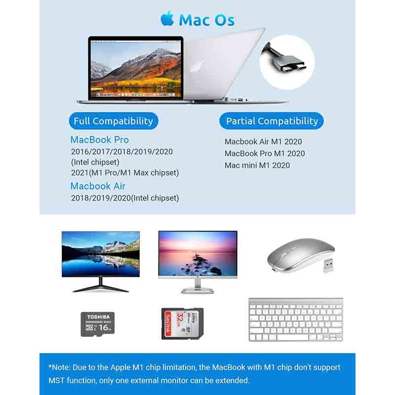 سازگاری: به طور خاص برای مک بوک پرو/ایر طراحی شده است، به صورت plug and play و بدون نیاز به درایور. داک QIYO 16 in 2 با مک بوک پرو 2016/2017/2018/2019/2020 (نه M1)، مک بوک پرو 2021 M1 Pro/M1 Max، مک بوک ایر 2018/2019/2020 (نه M1) سازگار است. با ویندوز و مک