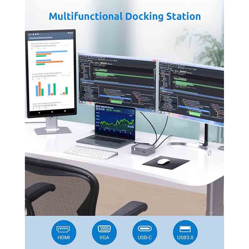 نمایشگر سهگانه با دو درگاه HDMI 4K: داک QIYO USB C مجهز به دو نمایشگر 4K HDMI توسعه یافته است و از نمایش سهگانه در مک بوک (HDMI 1+HDMI 2+ لپ تاپ) پشتیبانی میکند. پورتهای HDMI از وضوح تصویر تا 3840x2160esam30Hz و پورت VGA از وضوح تصویر تا 1920x1080esam60Hz پشتیبانی