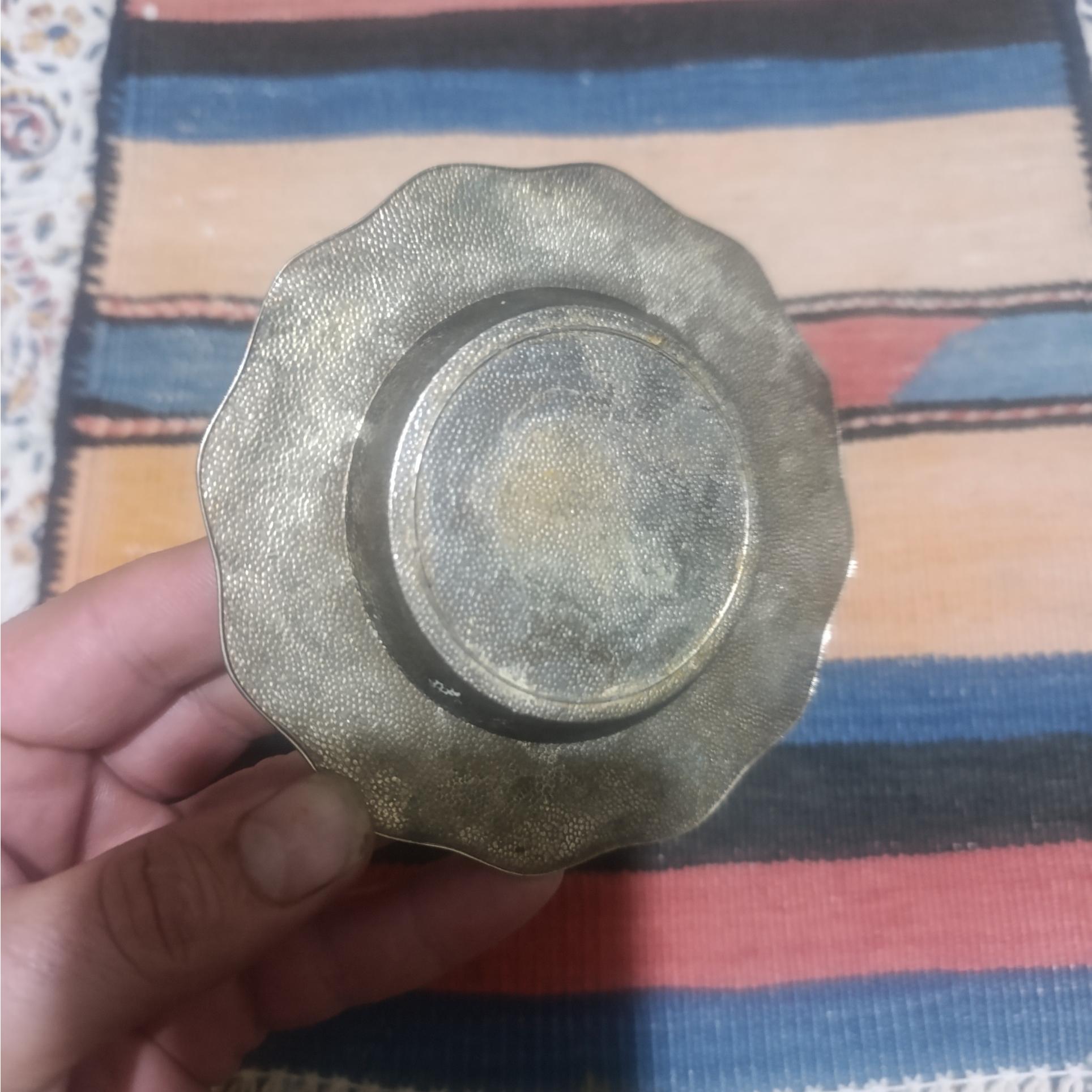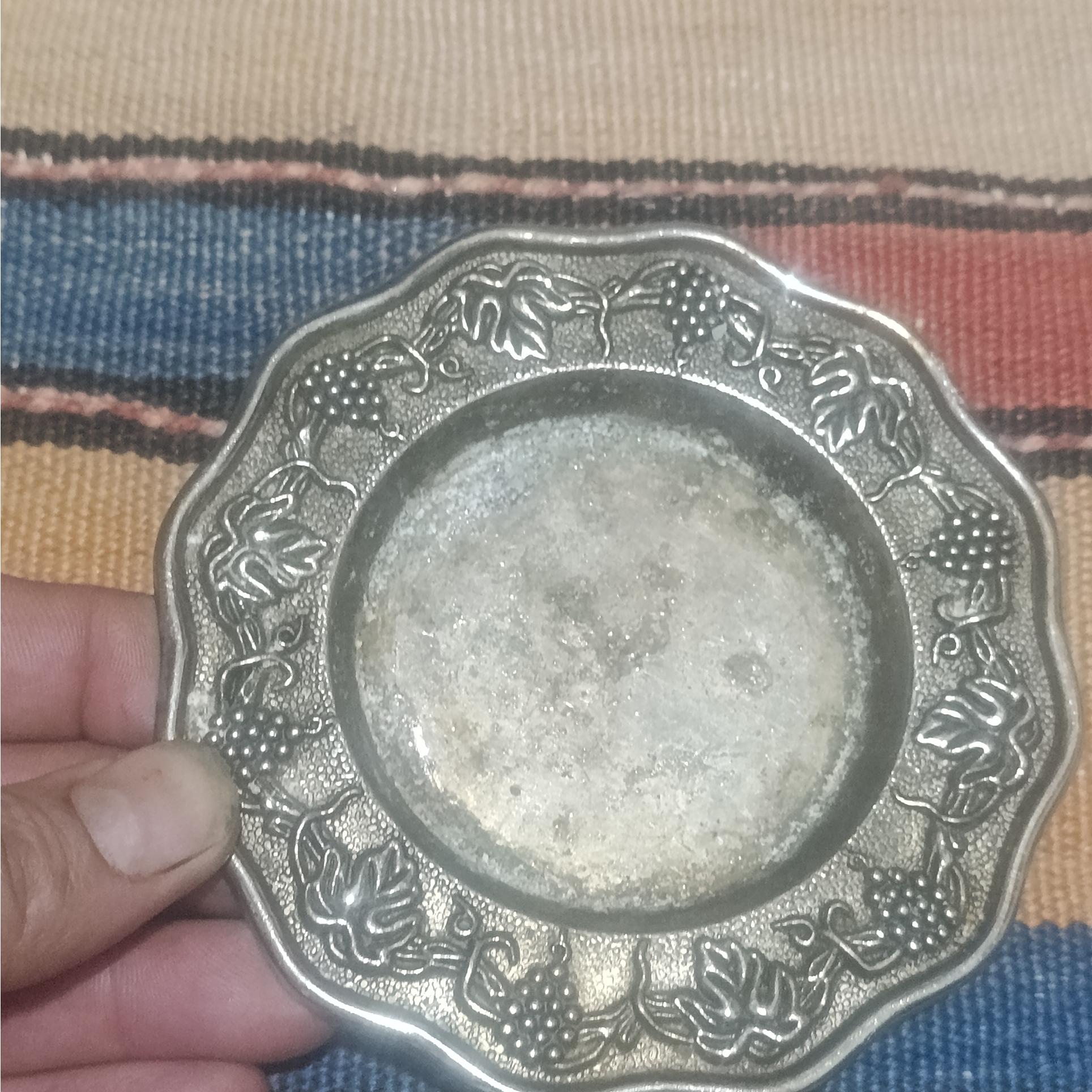 زیر سیگاری قدیمی جنسش نمیدونم چیه احتمالا یا برنج هست یا سیلور پلیت که به هر حال هر کدوم باشه قدیمی هست نقش برجسته