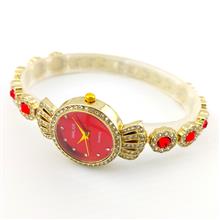 بدنه و بند استیل فلزی براق به رنگ طلایی با نگین های بزرگ و کوچک و قفل قفل دستبندی