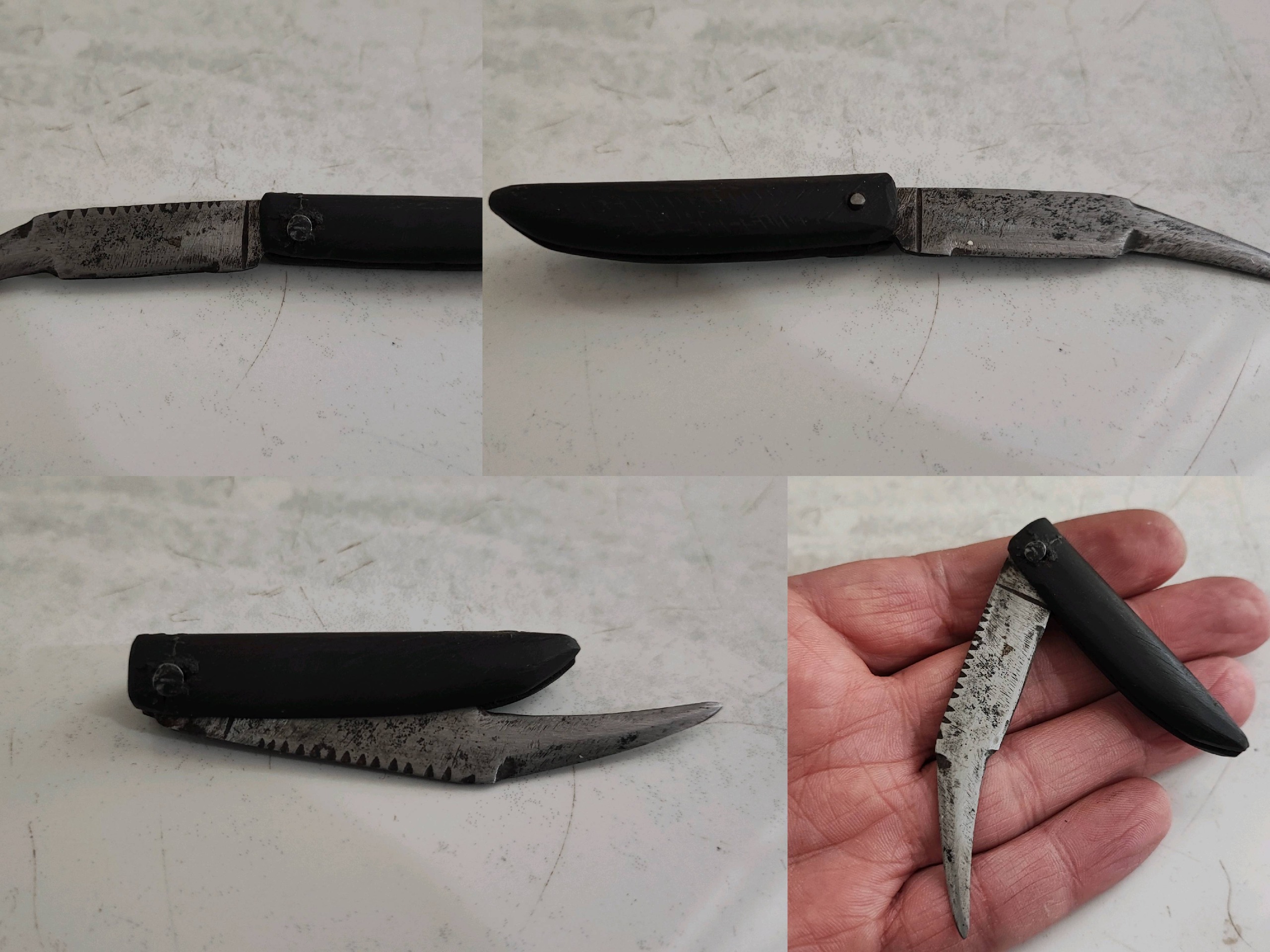 13 سانت طول، دسته شاخ و تیغ فولادی، تکه کوچکی از دسته شکسته و تعمیر شده، زیبا و نایاب و کلکسیونی