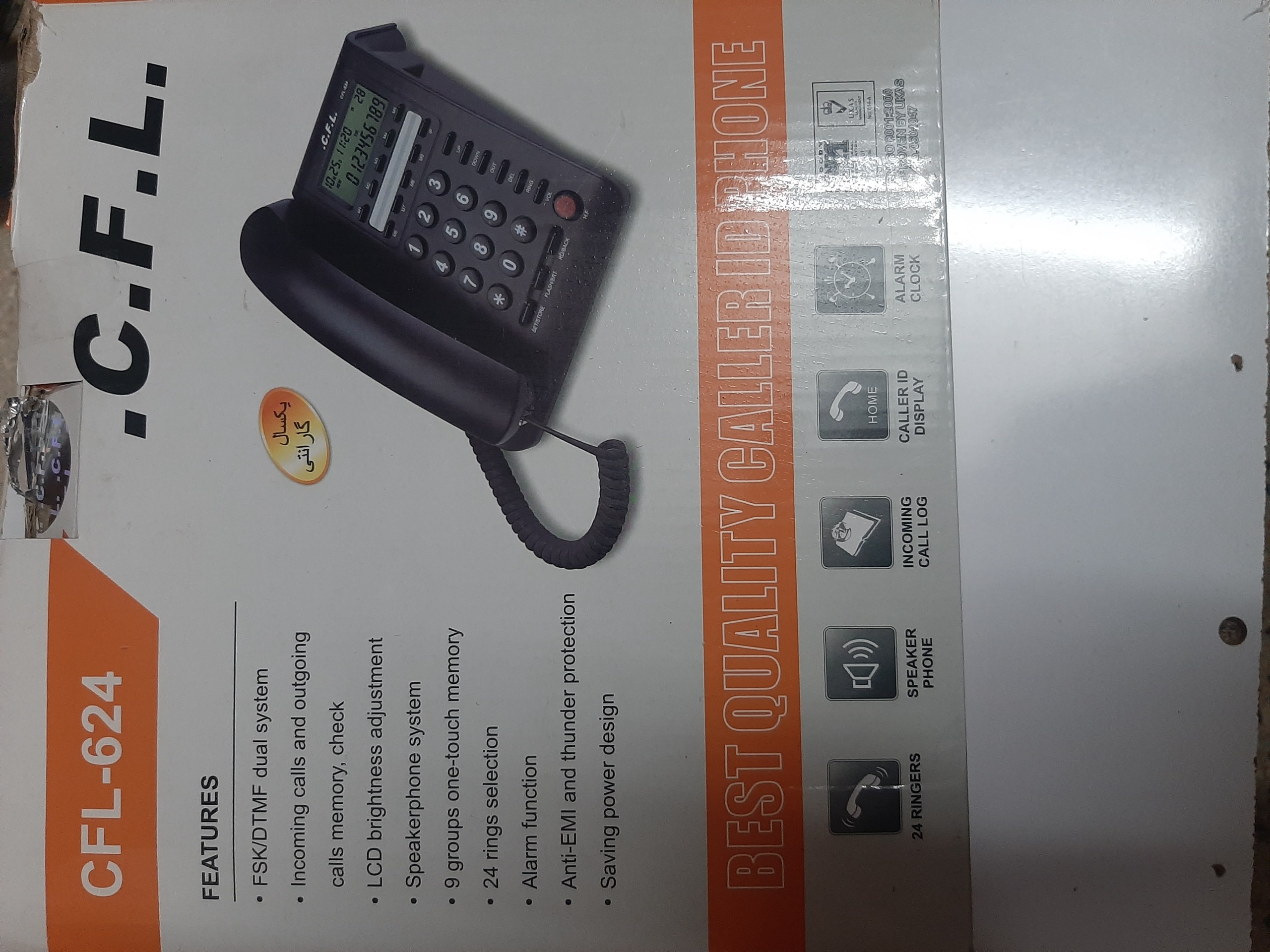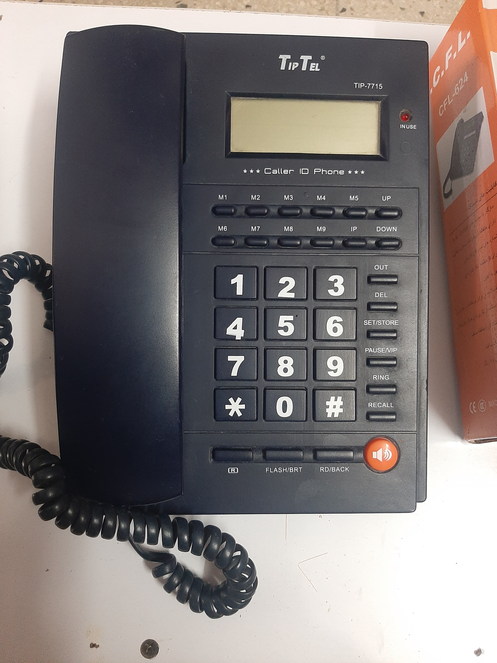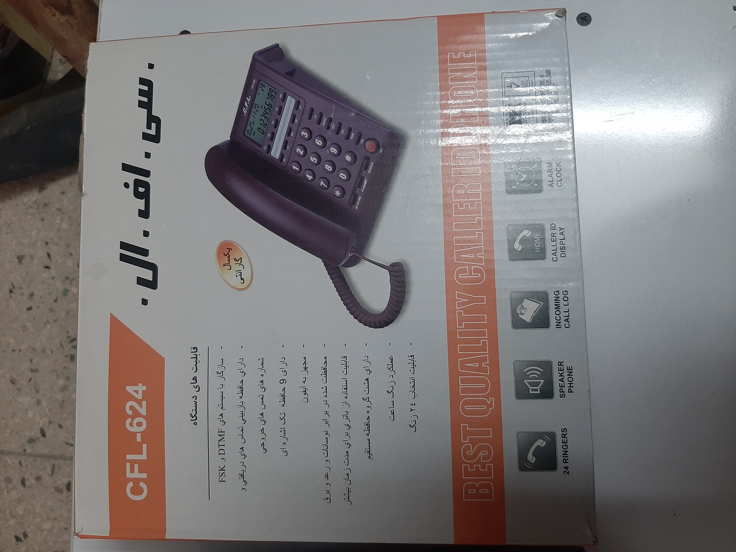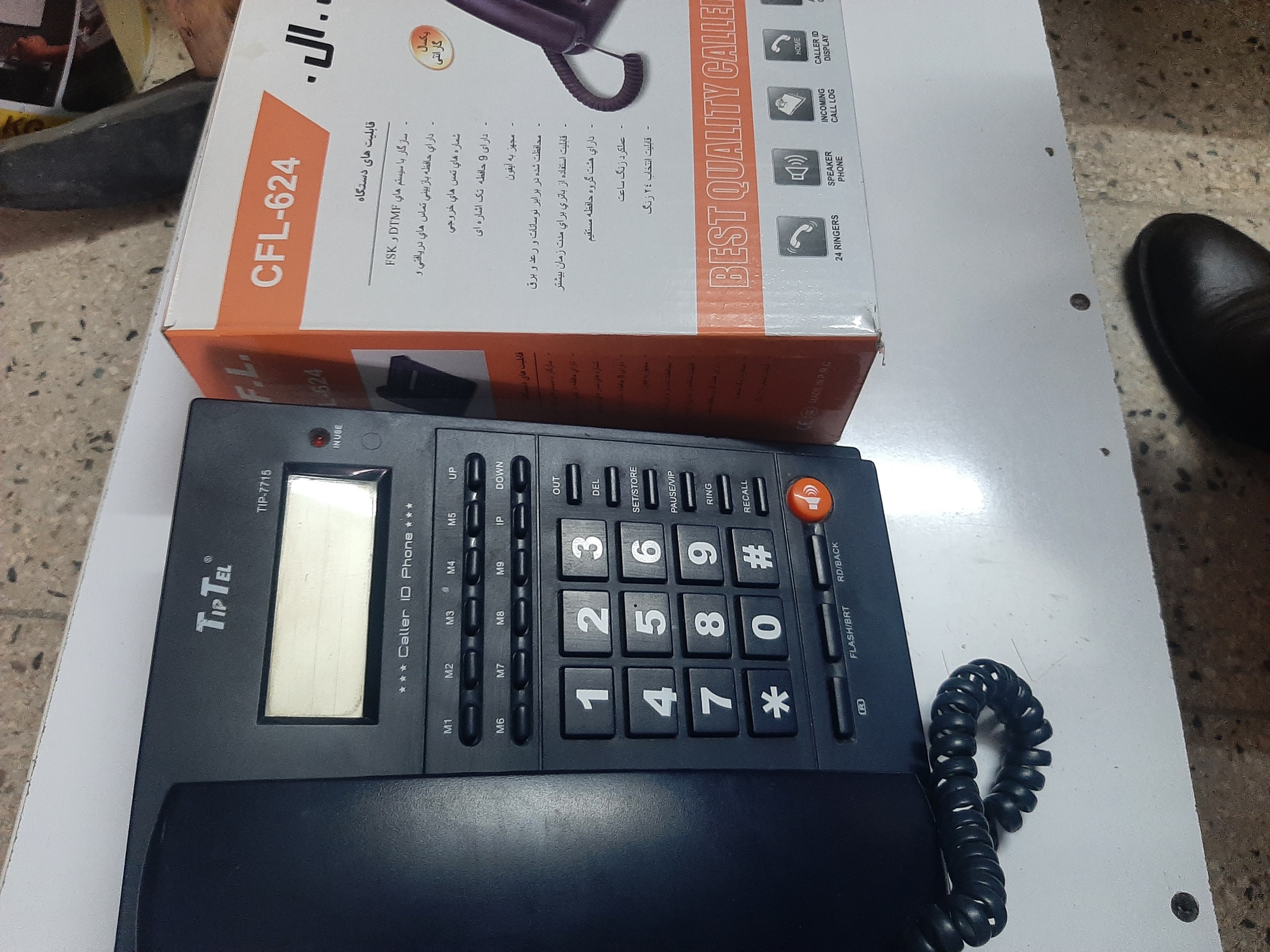 یک دستگاه تلفن رو میزی در حد نو  با 9حافظه داخلی،صفحه دیجیتال شماره انداز،با مارک سی اف ال624 با قابلیت 24نو زنگ تماس،محافظ شده در برابر نوسانات برق،کلی امکانات با کارتن و کابل متصل به پریز بسیار هوشمند و کارایی عالی با 1 سال ضمانت قیمت فقط 950هزارتومان هست.اکبند این تلفن در بازار بالای 2میلیون تومان هست میتونید قیمت بگیرید