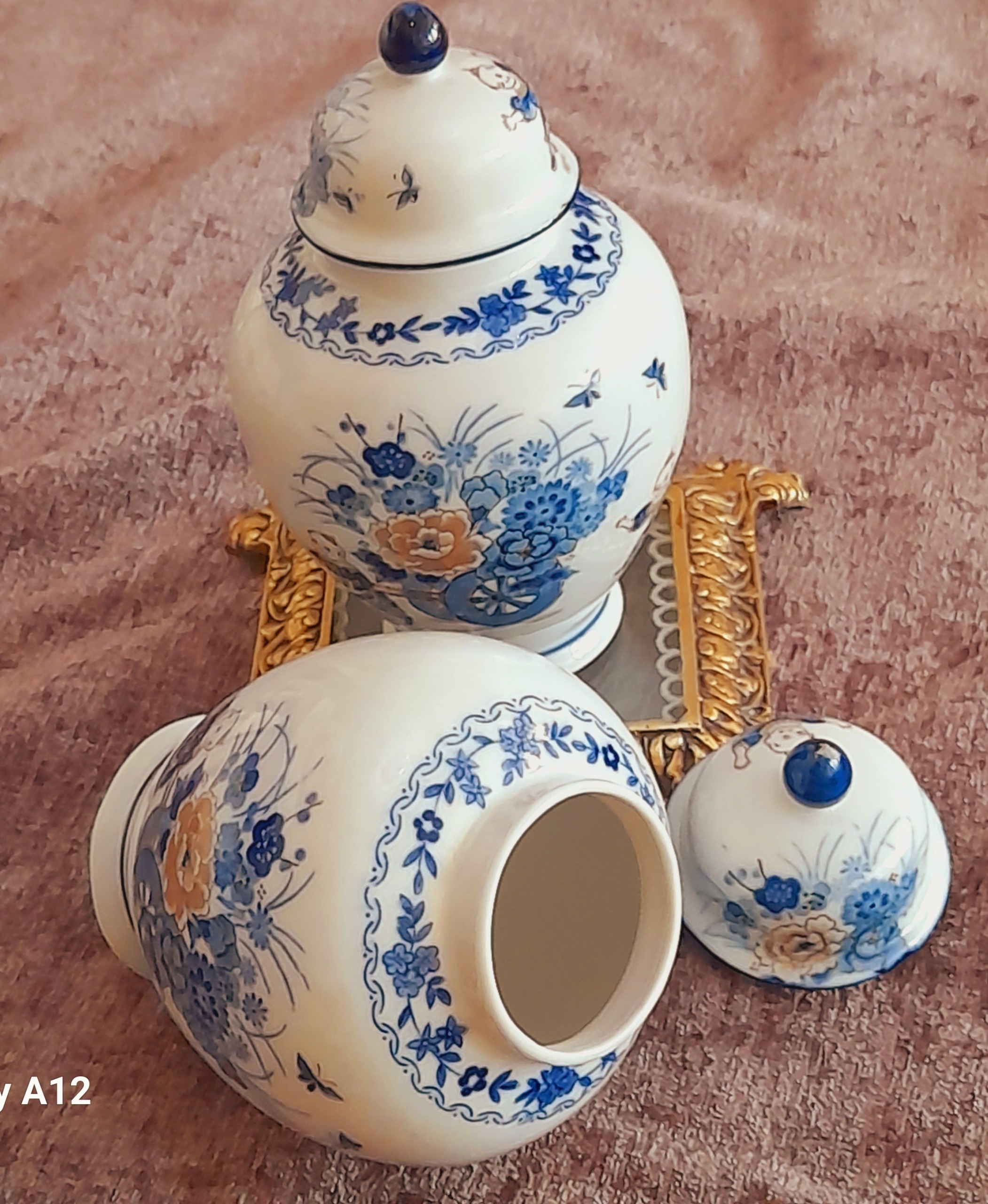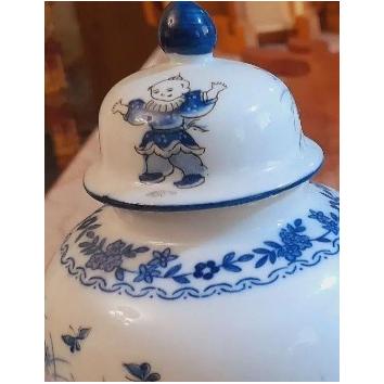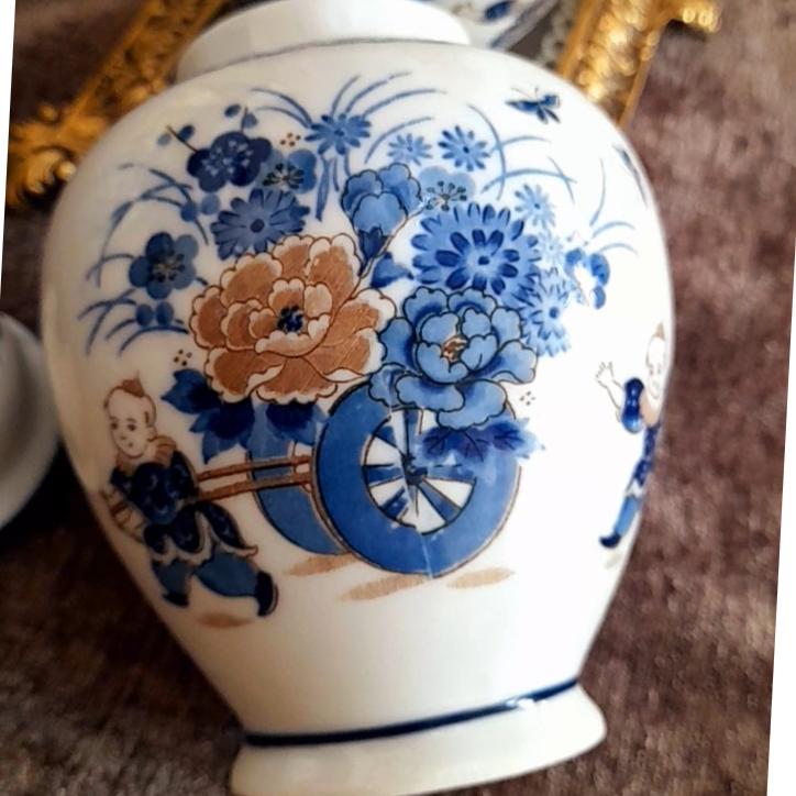 دو عدد بانکه زنجبیلی ژاپنی با گلهای آبی و قهوهای روشن ،معروف طرح آسیایی ،پسرکی گاری گل را میکشد