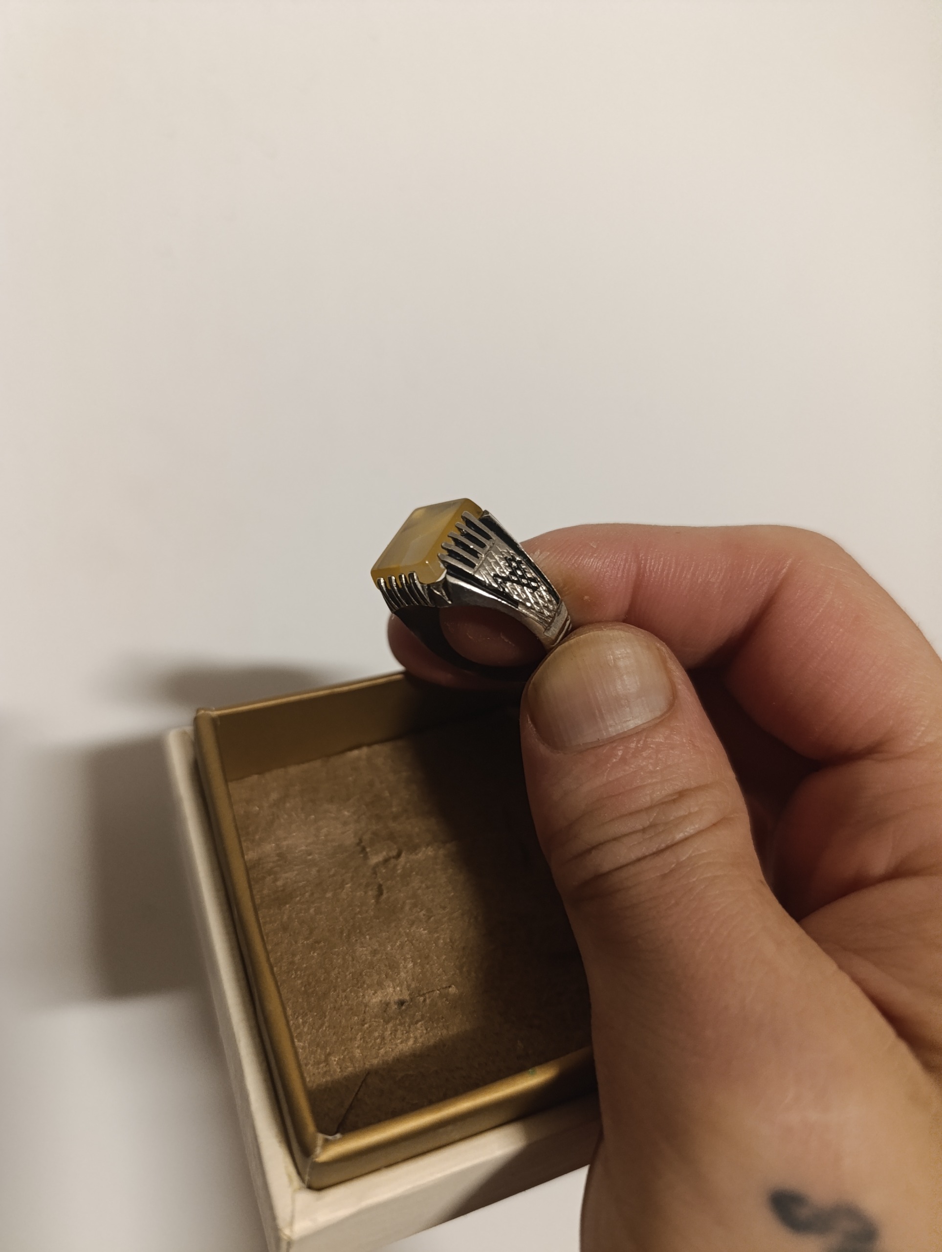 انگشتر فاخر شرف شمس دست ساز با قلم کاری و سیاه قلم و سنگ درجه یک اصل و جنس نقره با رو کش و آبکاری رادیوم و وزن حدودا 6٫597