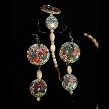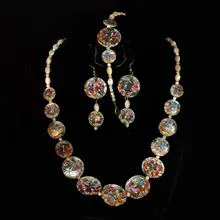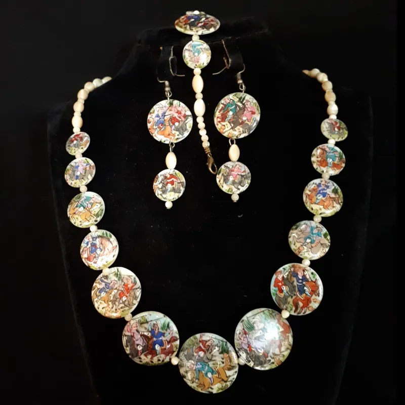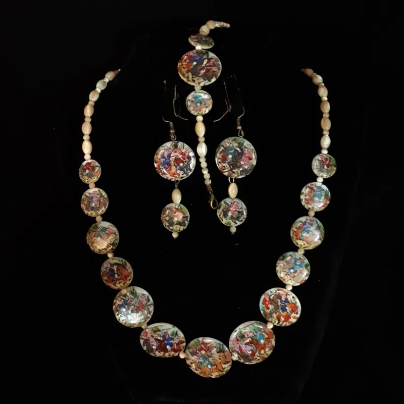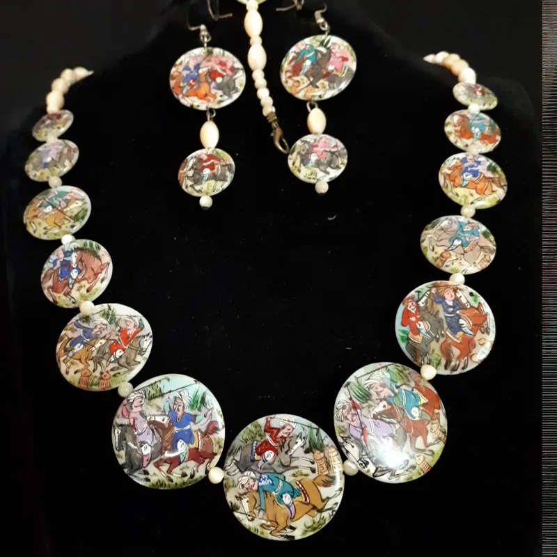 گردنبند صدف به سفارش بنده بوده که نقاشی مینیاتور شده و سرهم شده که شامل گردنبند . دستبند . گوشواره میباشد همگی از جنس صدف طبیعی بوده و این جنس جز کمیابترین اکسسوری زنانه در ایران میباشد و چنانچه از این مدل گردنبند دوست عزیزی عکس بفرستد در قیمت فروش این