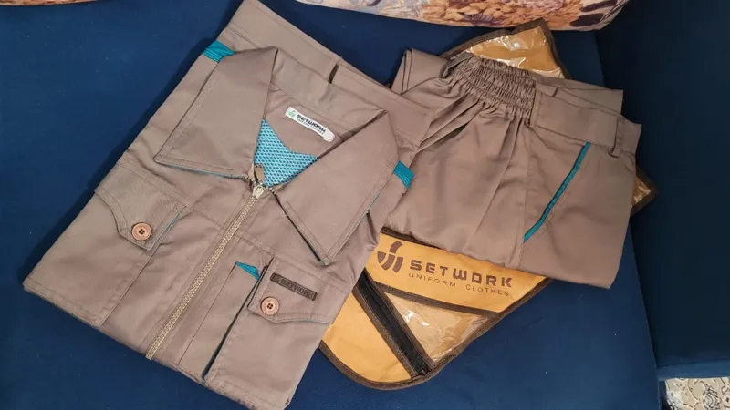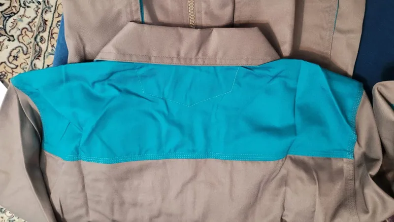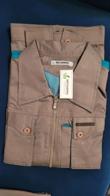 ست دو کاره لباس کار(کاپشن) و شلوار کار مهندسی قهوه ای روشن یا خاکی با سبز آبی بسیار زیبا به وزن لباس و شلوار توجه فرمایید /بسیار شیک و عالی