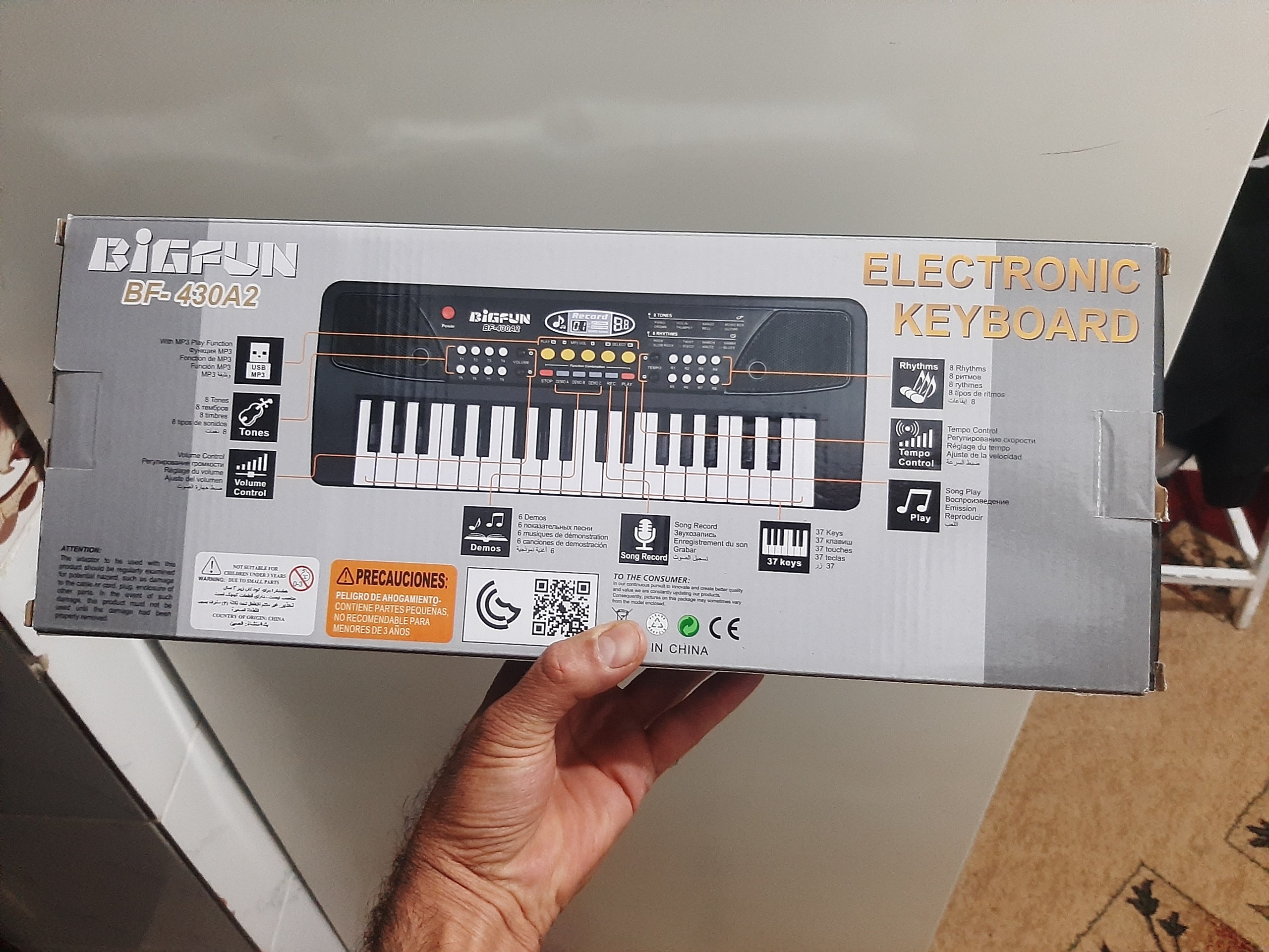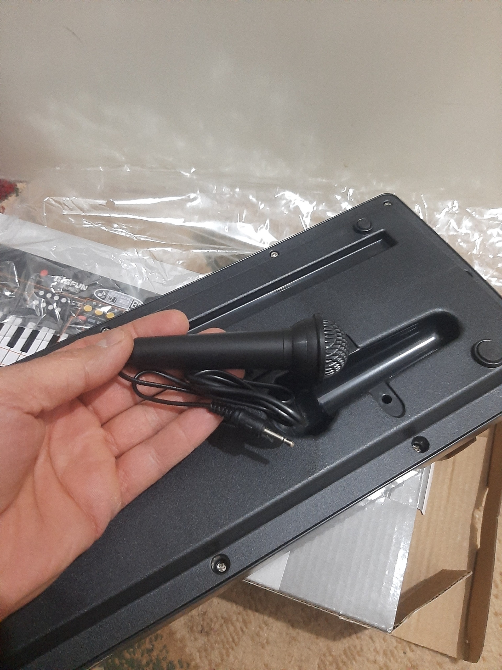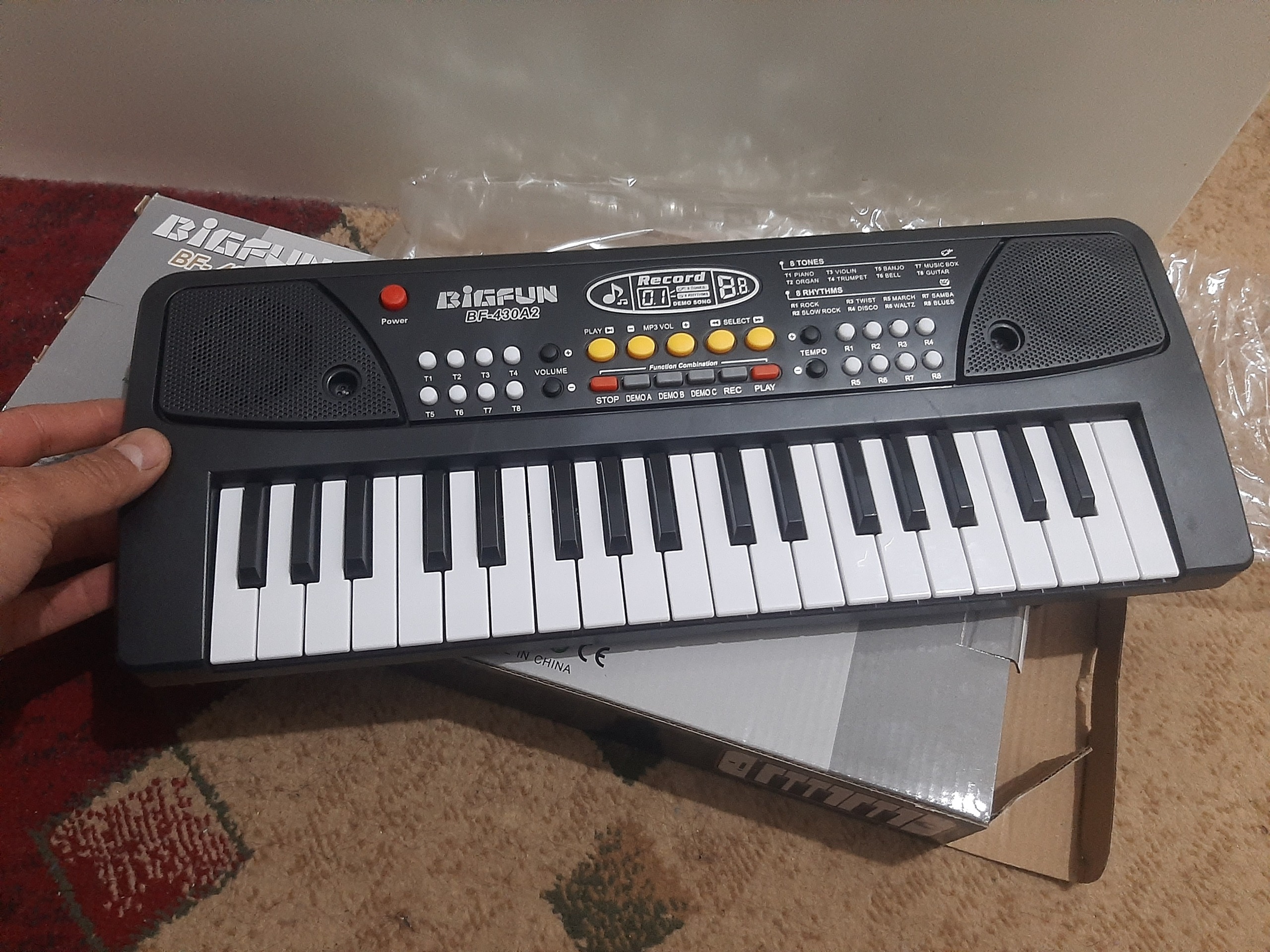 پیانو واقعا در حد نو برا بچه م گرفتم رو هم رفته 5 نصف روزم باهاش بازی نکرد.علاقه ای نشون نداد میخوام بفروشم.انگار داری نو از مغازه میگیری.یه میکروفن کوچک داره.همراه با کابل یو اس بی که باید سر شارژر موبایل بزنی روش تا کار کنه.باتری هم میخوره که من اصلا درب باتریشو باز نکردم.کارتن هم داره.تاکید میکنم واقعا نوست