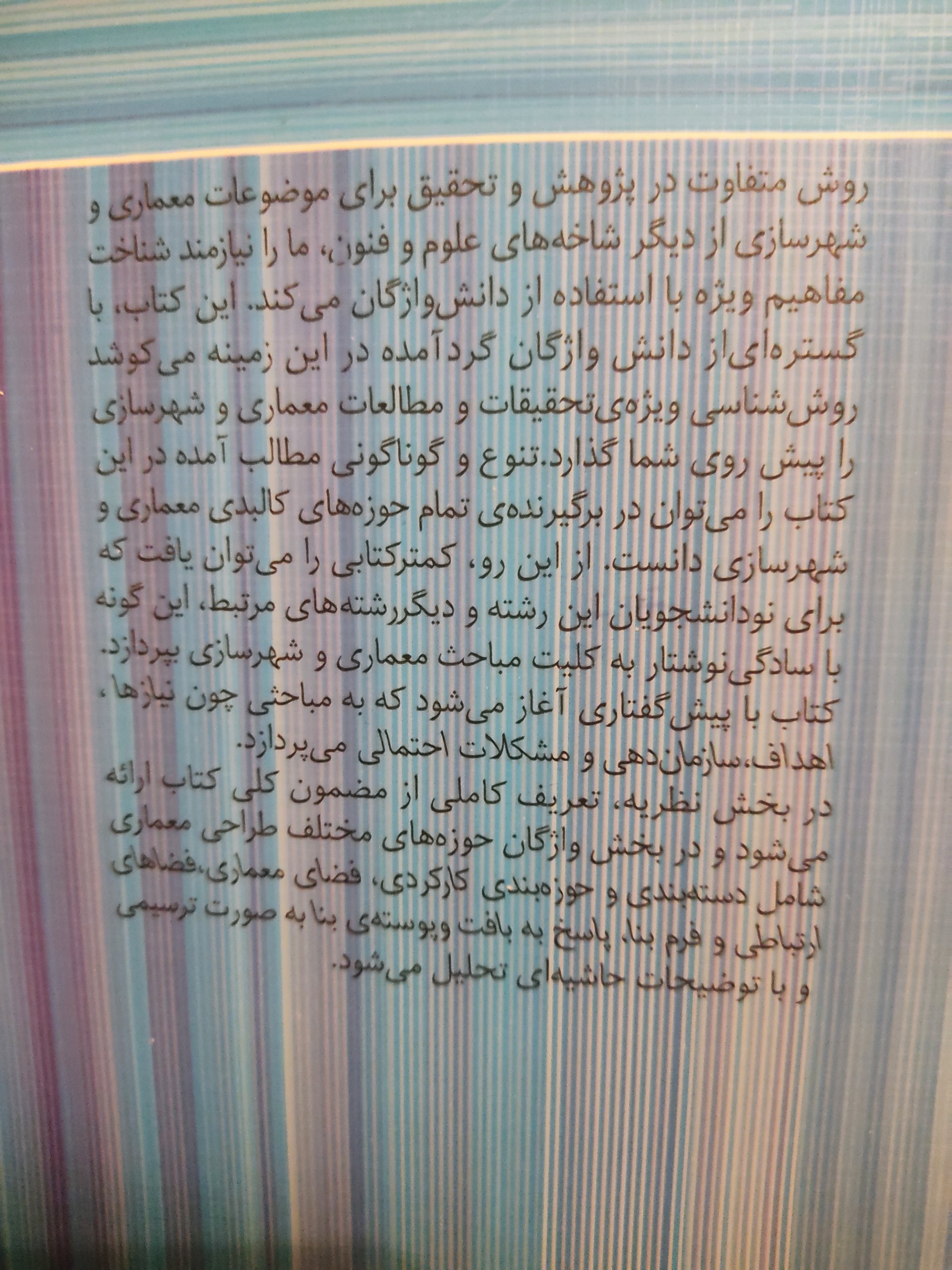 روش متفاوت در پژوهش و تحقیق برای موضوعات معماری و شهرسازی از دیگر شاخه های علوم و فنون ما را نیازمند شناخت مفاهیم ویژه با استفاده از دانش واژگان میکند این کتاب با گستره ای از دانش واژگان گرد آمده در این زمینه میکوشد روش شناسی ویژه ی تحقیقات و مطالعات معماری و شهرسازی را پیش روی شما گذارد. تنوع و گوناگونی مطالب آمده در این کتاب را میتوان در برگیرنده ی تمام حوزه های کالبدی معماری و شهرسازی دانست از این رو کمتر کتابی را میتوان یافت که برای نودانشجویان این رشته و دیگر رشته های مرتبط، این گونه با سادگی نوشتار به کلیت مباحث معماری و شهرسازی بپردازد.