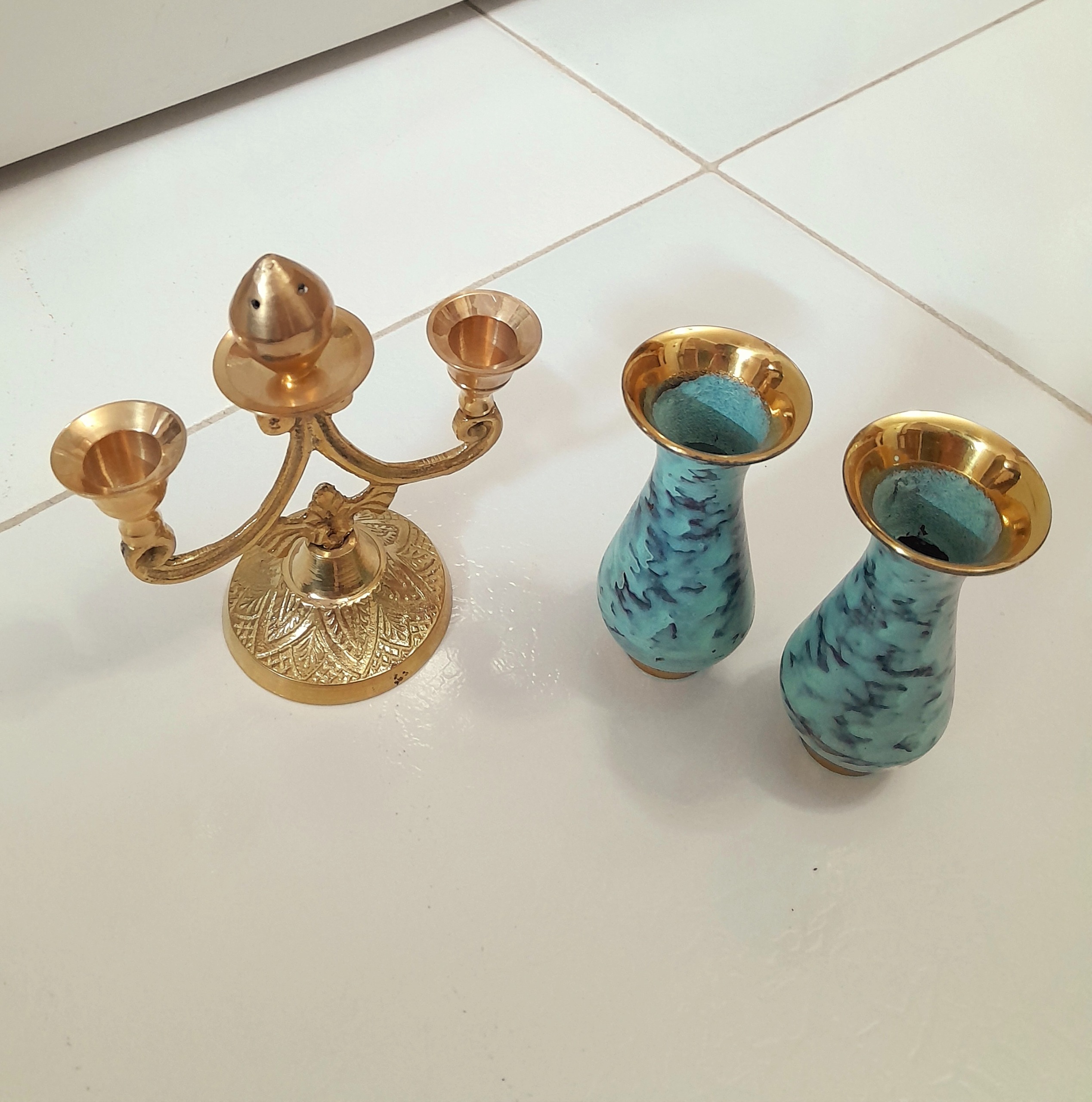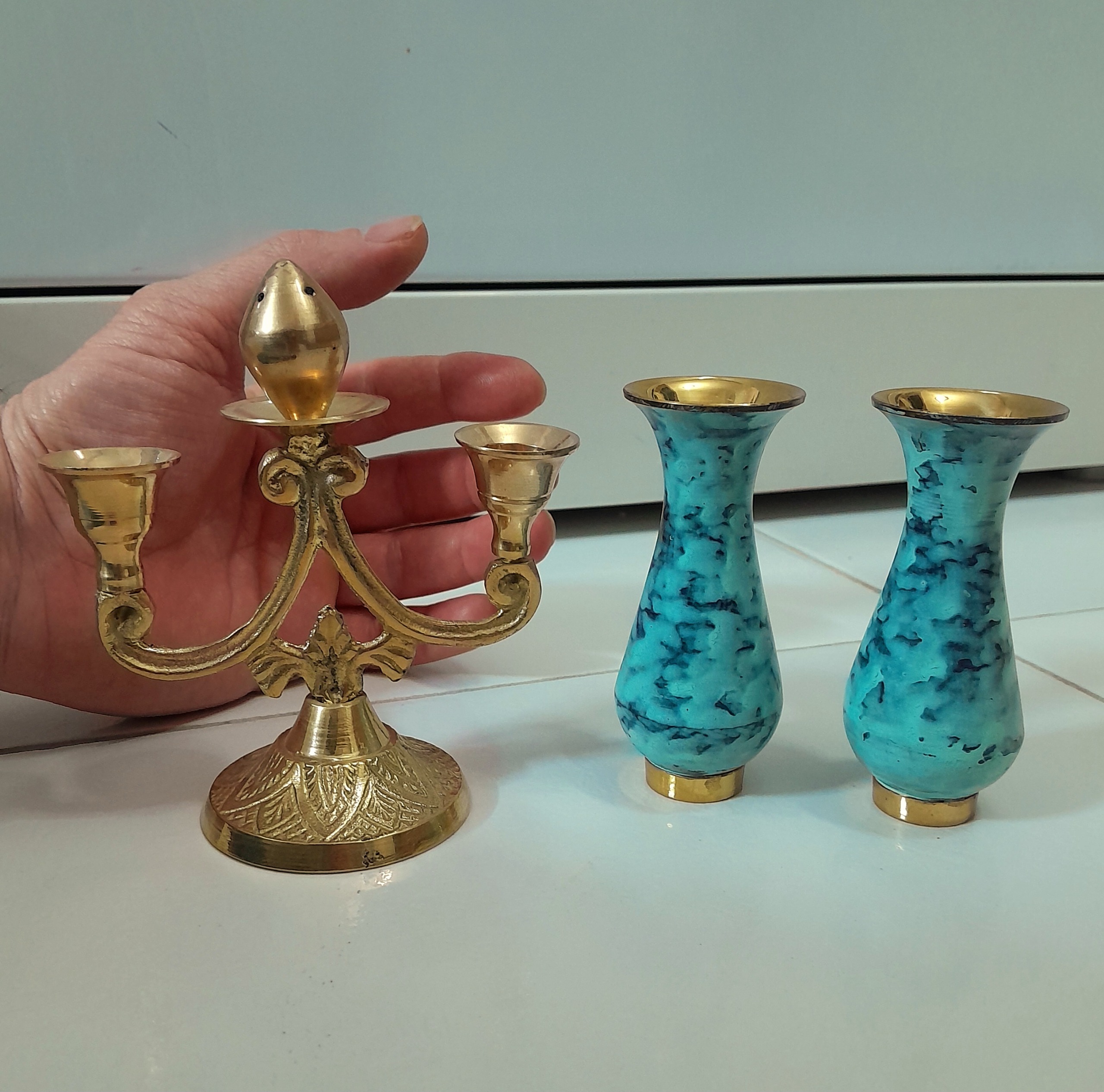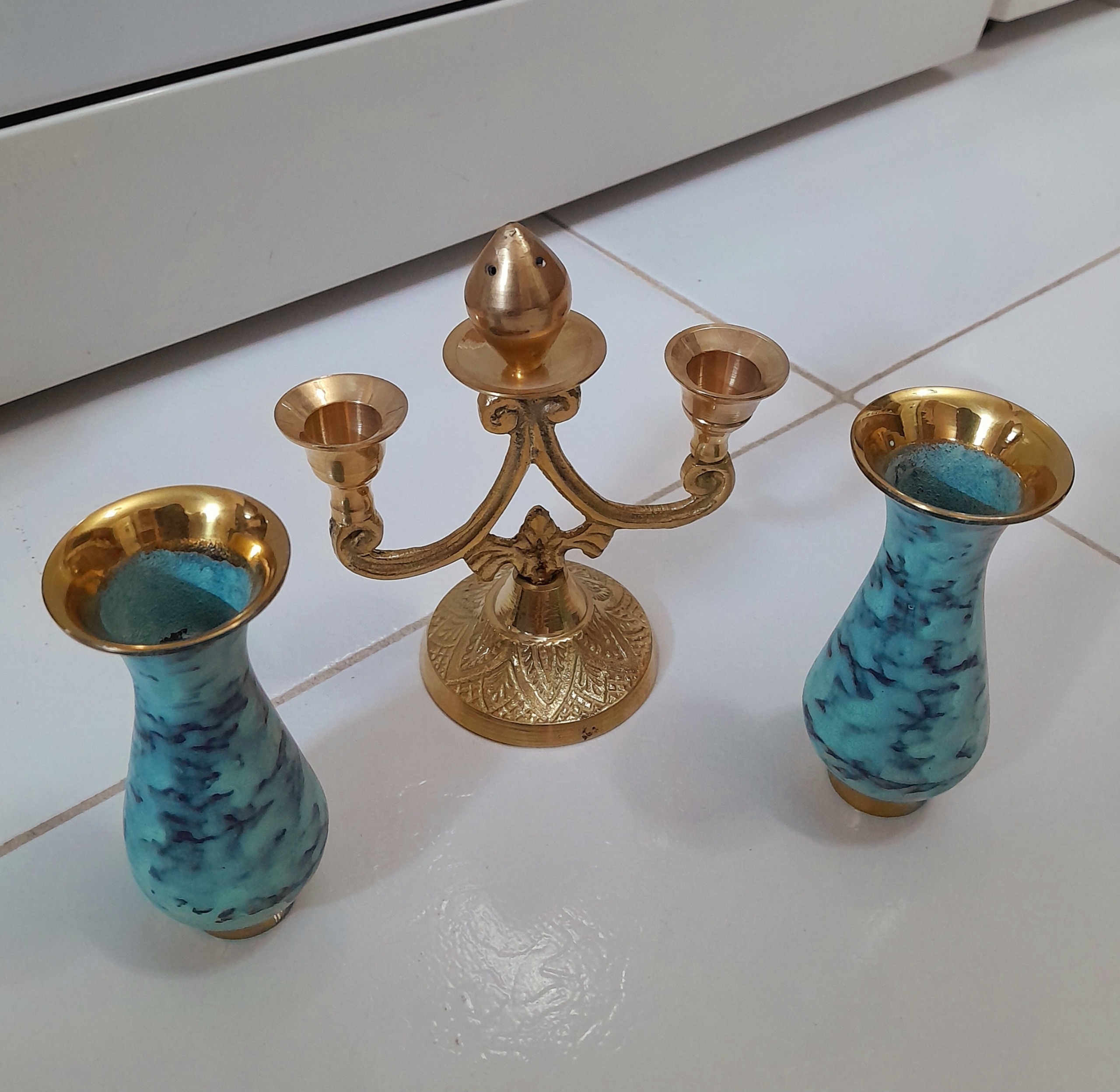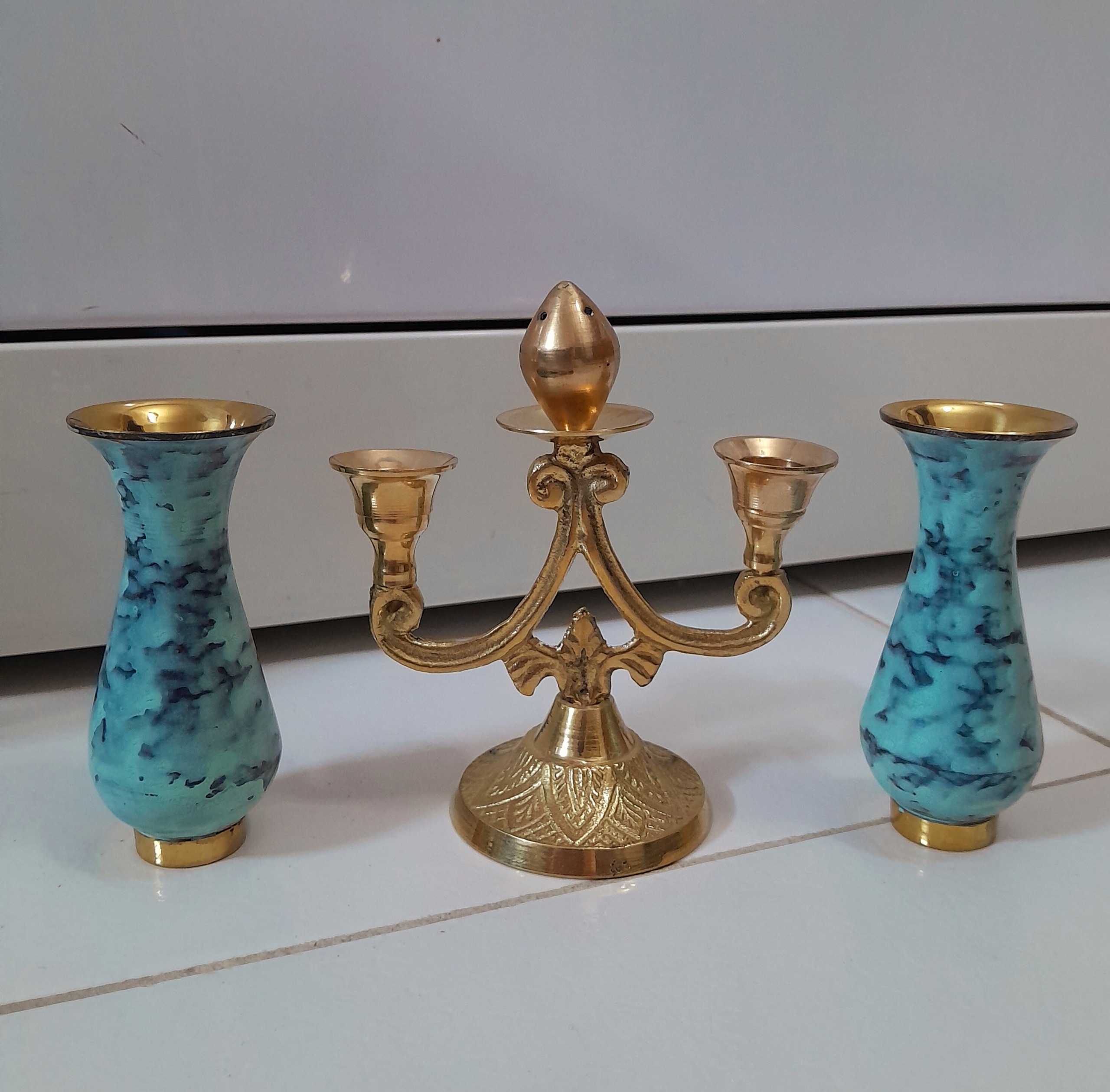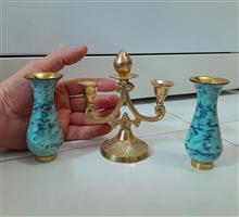 شمعدان برنجی کوچک زیبا و خاص همراه با 2عدد گلدان برنجی آنتیک فیروزه ای.