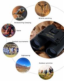 اقلام موجود در بسته بندی: دوربین دوچشمی به همراه بند گردنی، کیف برزنتی، دستمال تنظیف و برگ راهنمای دوربین.