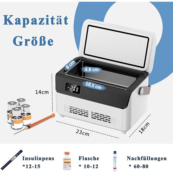 (صفحه نمایش لمسی LCD): روی یخچال انسولین یک صفحه نمایش بزرگ وجود دارد که میتواند در زمان واقعی نمایش داده شود. که برای سالمندان کاربردی است. طراحی زاویه قوس مخزن داخلی از برخورد دارو هنگام رانندگی جلوگیری میکند. سیستم یادآوری هشدار صمیمی، یادآوری باتری کم،