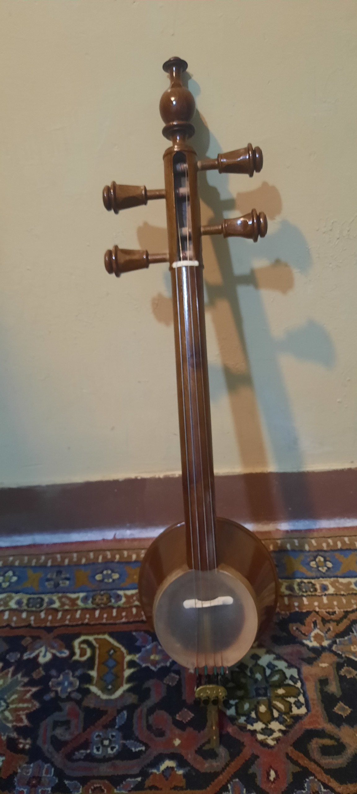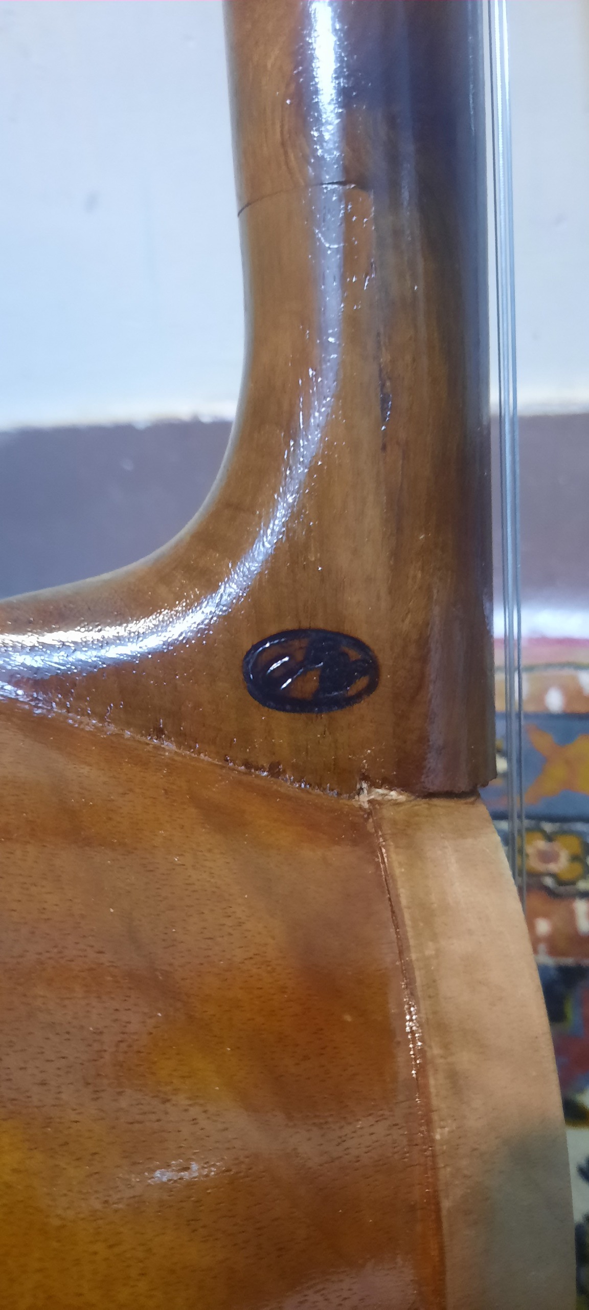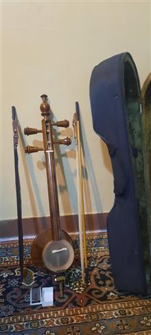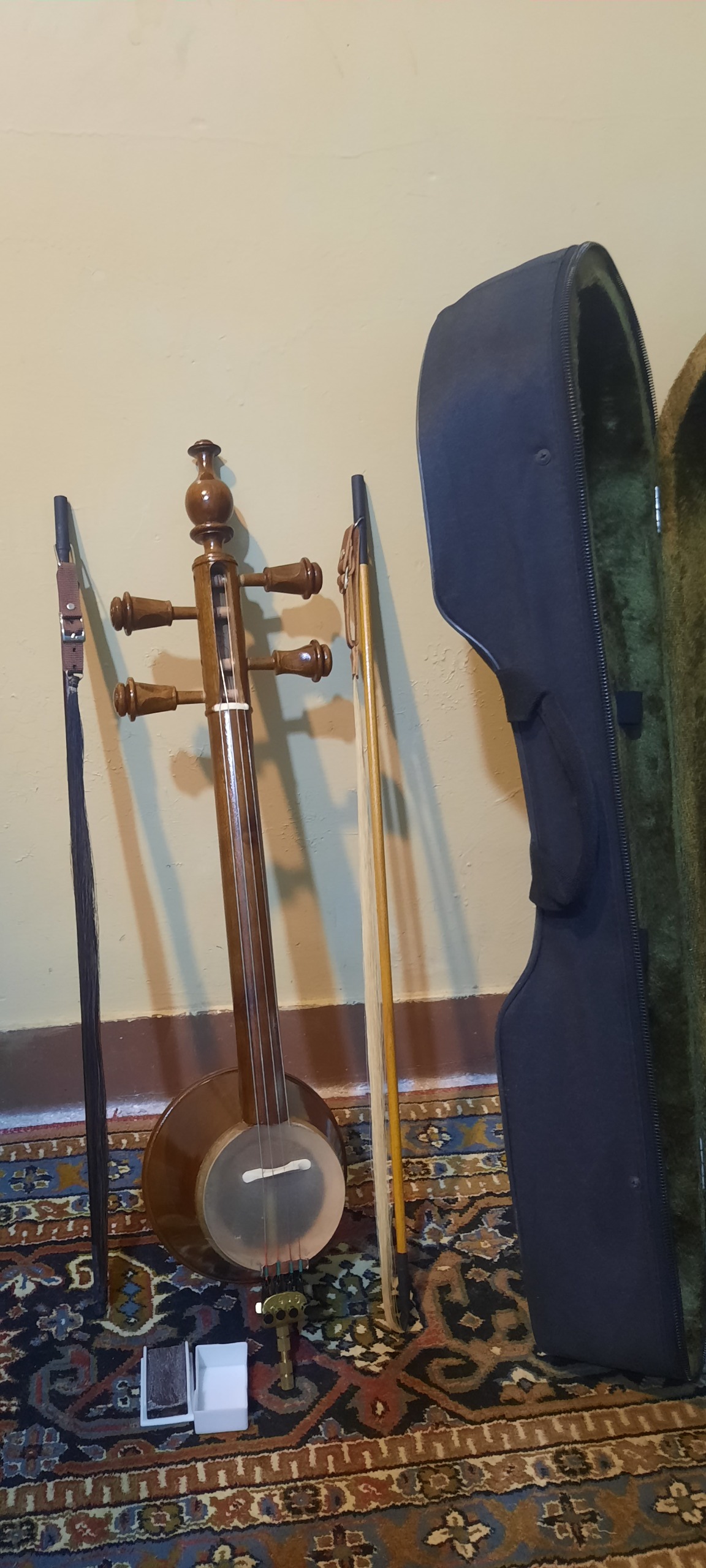 کمانچه پشت باز ، ساخت دست استاد مراحمی در کارگاه شهر خرم آباد ، همراه دوعدد آرشه یکی با دم اسب و یکی اورجینال شرکتی همراه هاردکیس و یک عدد کلیفون
