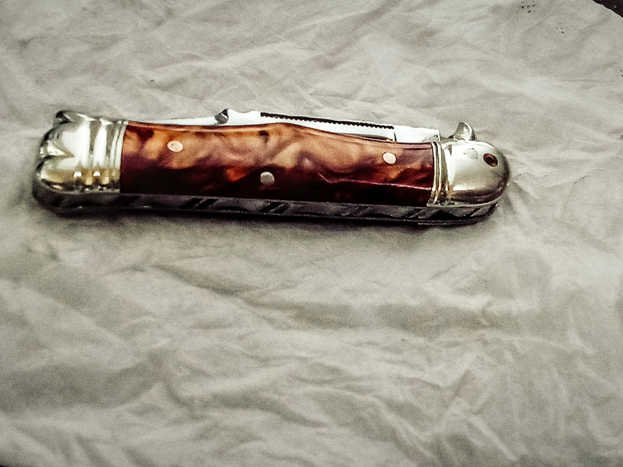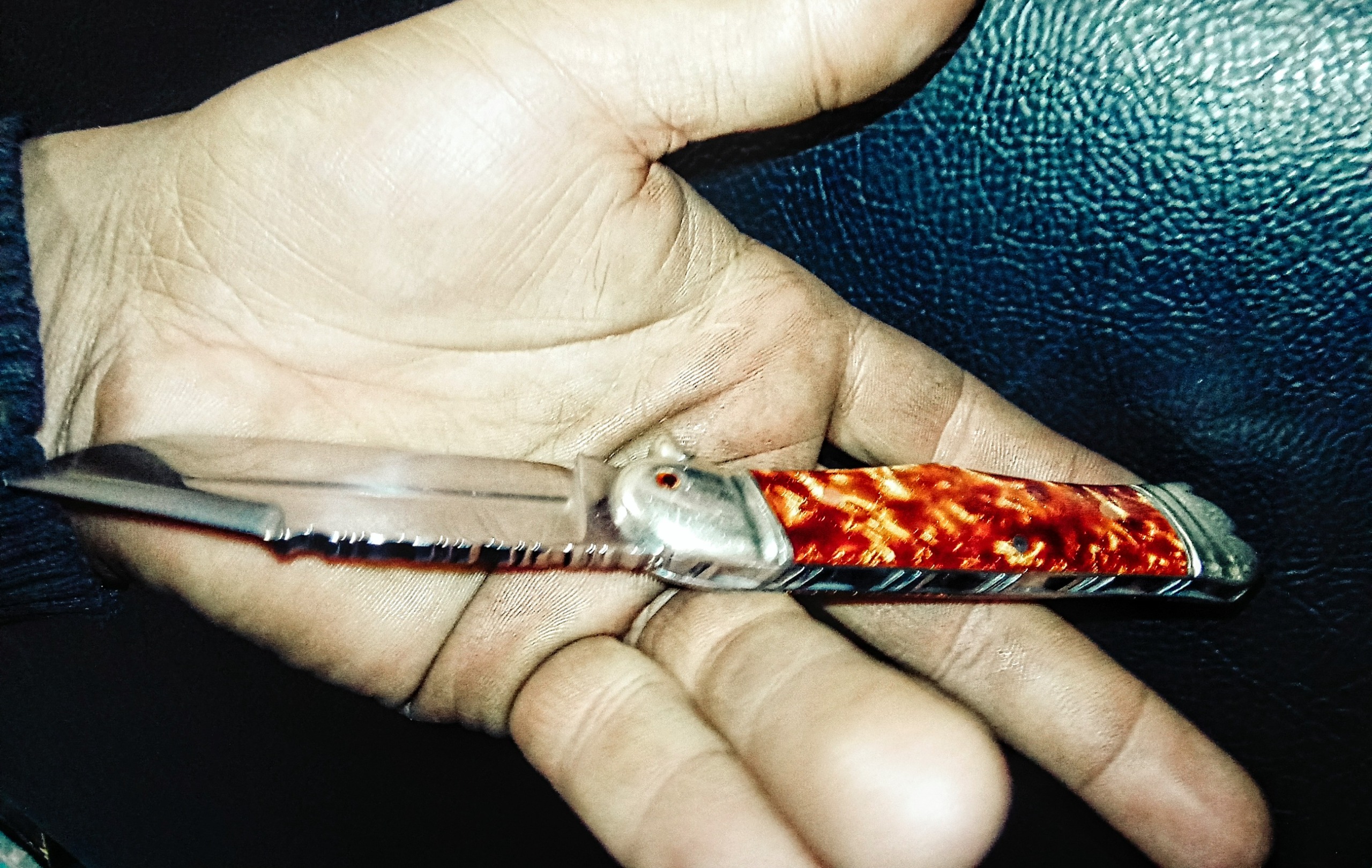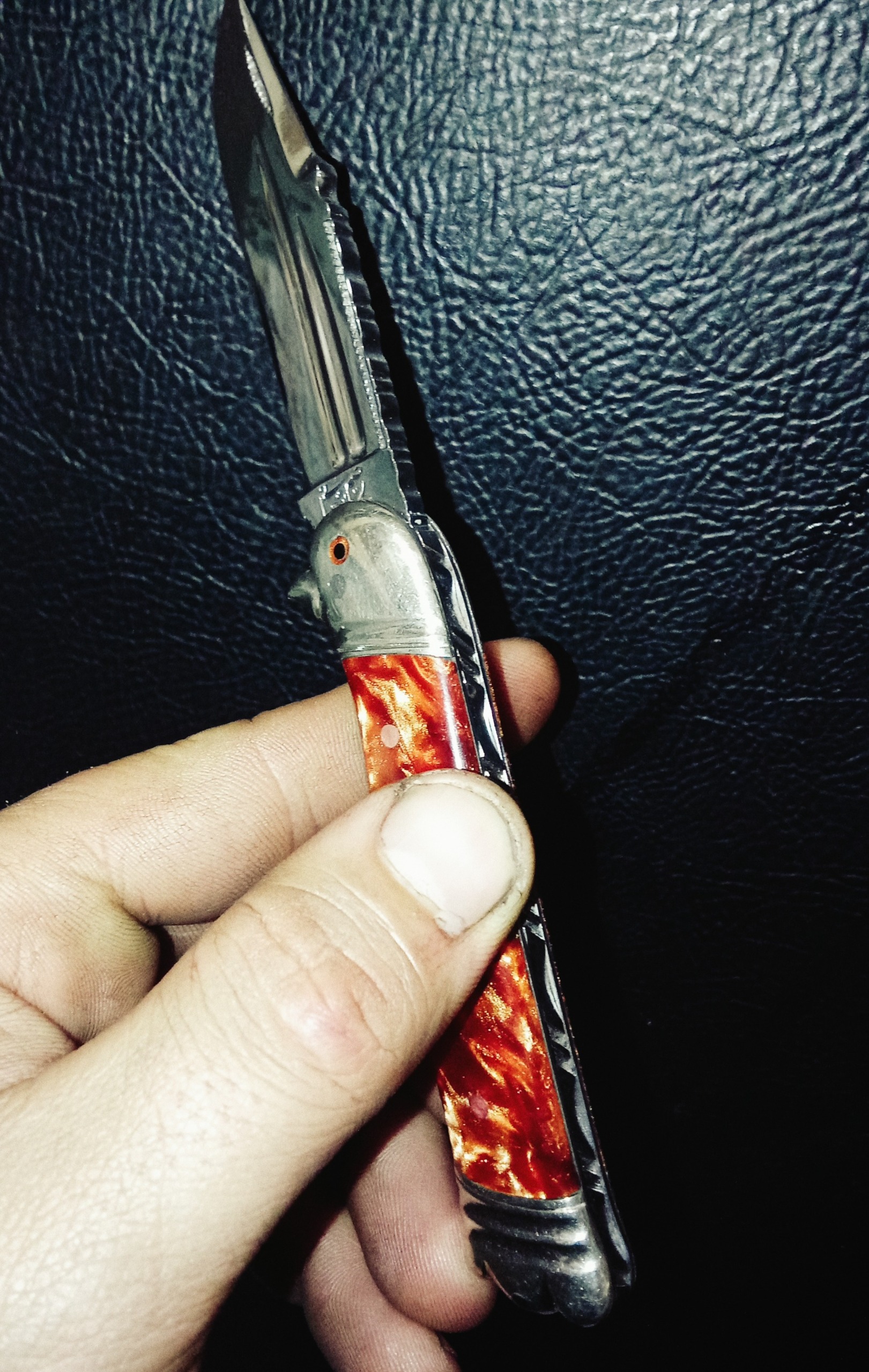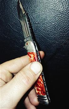 چاقو کلکسیونی وسفارشی دسته کهربا آتشی مدل لاینر لاک قفلدار که ضامن داخل دسته میباشد دسته طرح تاجوپرنده تیغه اره فولاد آبدیده عین تیغ جراحی که طرحدار جای ناخن دوقسمت تیغه زنجیررده شده وپشت تیغه و دسته جودان کاری سوهانکاری شده وفنر بسیار قوی پرتاب تیغه شلاقی بدون درز ولقی وبدون ایراد ازهرحاض سایز 18سانت هر سوالی باشه درخدمتم وسفارش هر نوع چاقوشکاری کلکسیونی وبازاری وقدیمی پذیرفته میشود