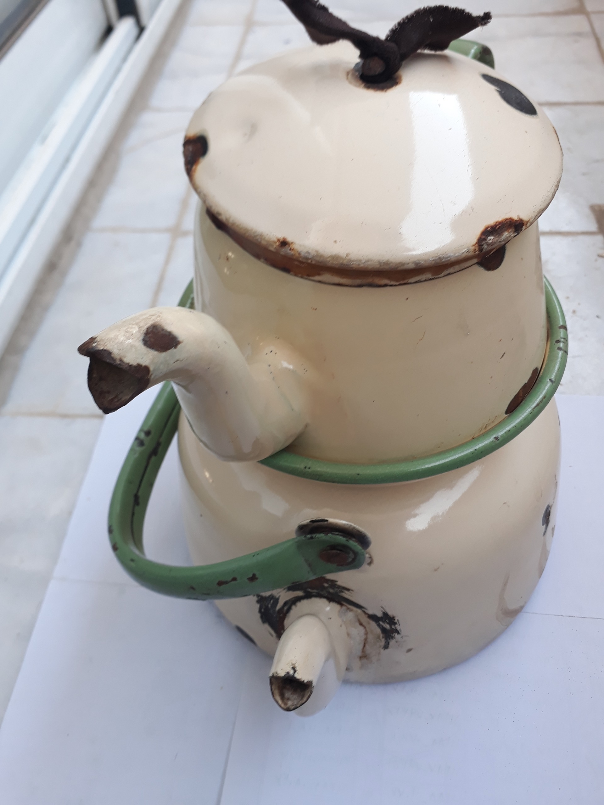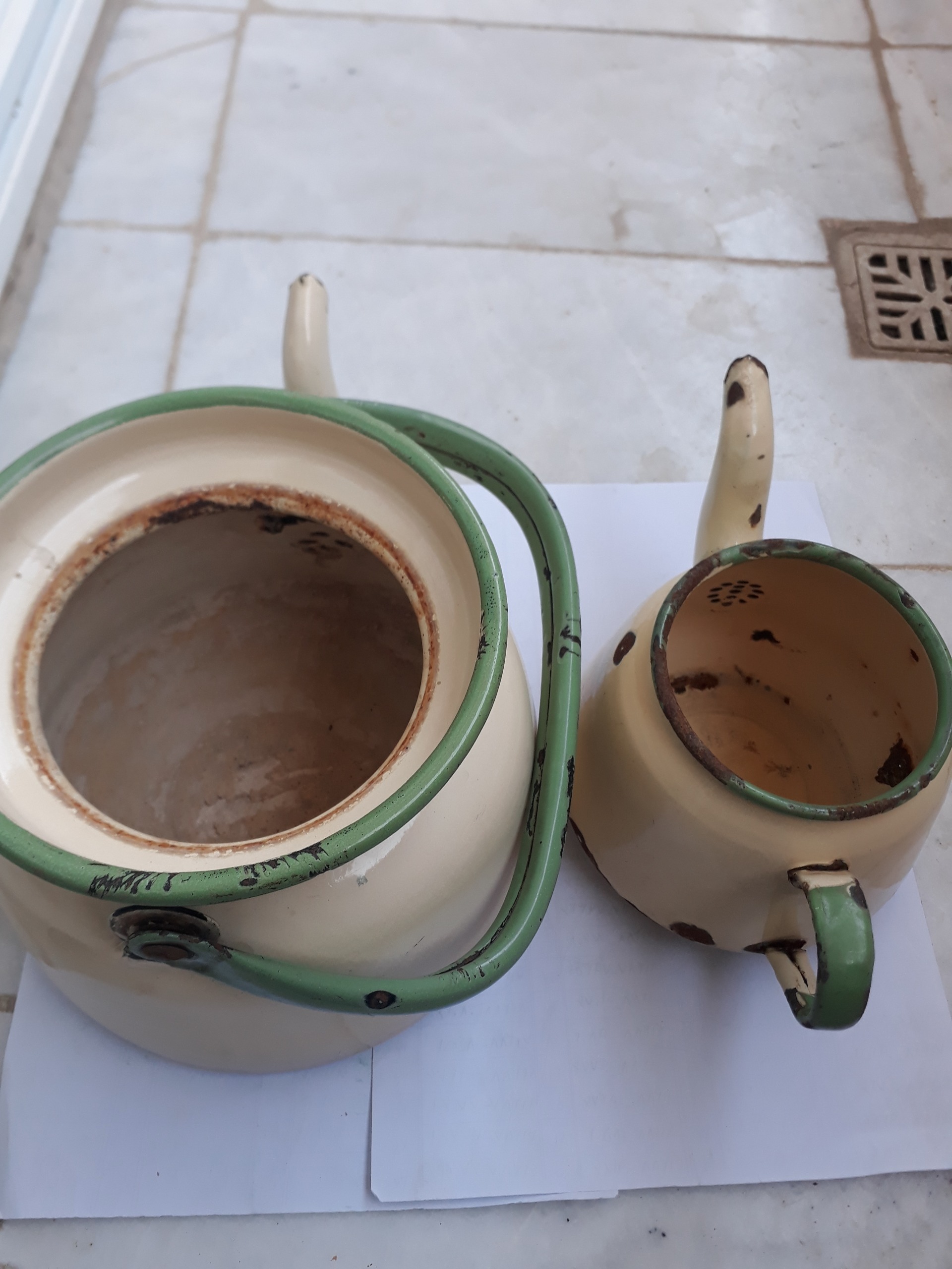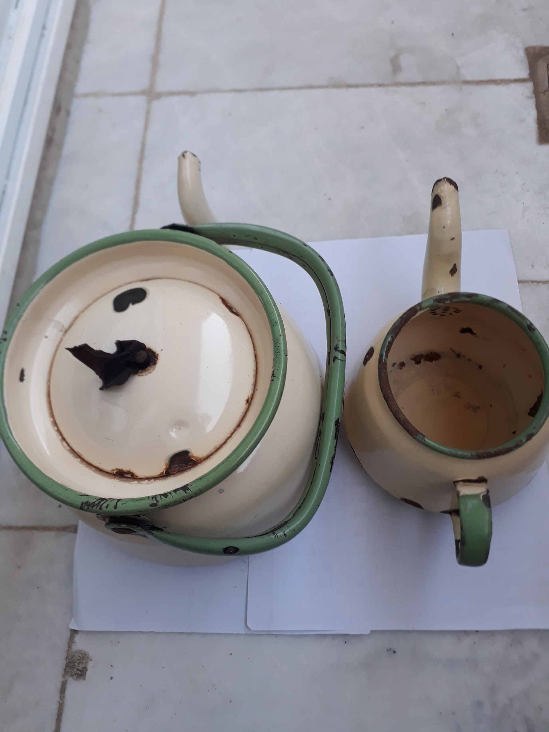 اینها مال 70 سال قبله فقط رنگ مجدد میکنن و دکور میگذارن هم کتری هم قوری یک سوراخ ریز دارن که لحیم باید بشه بعد رنگ درب قوری نداره ولی کتری درب دوگامه قابل مصرف هست روی هم سوار که بشن قشنگ و تکمیل هستن