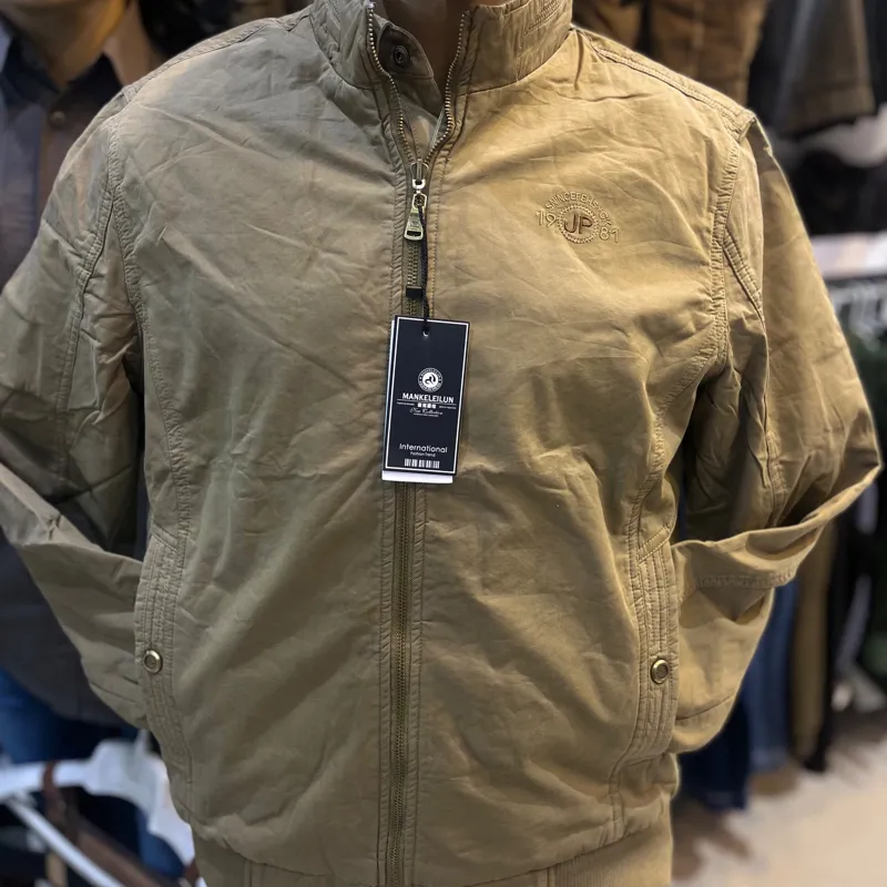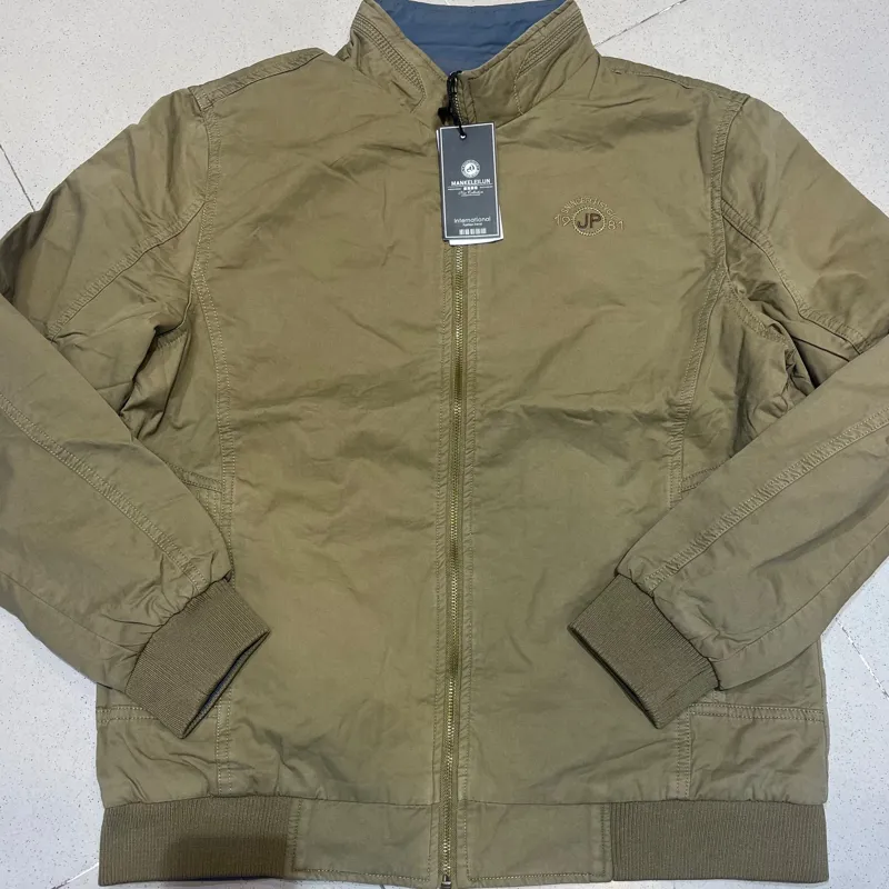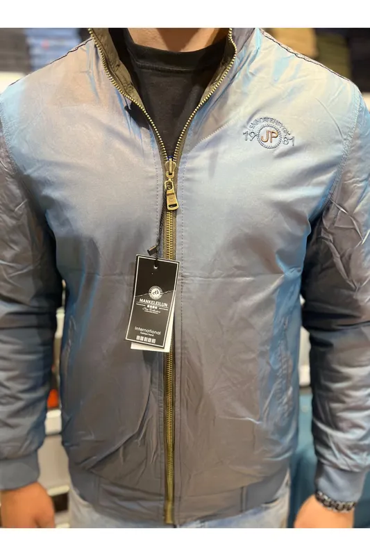 کاپشن پایین کش کتان دو رو برند جیپ در دو رنگ یشمی و کرم رنگ که روی دیگر آن آبی فیروزه ای هست تقریبا که در عکس موجود است