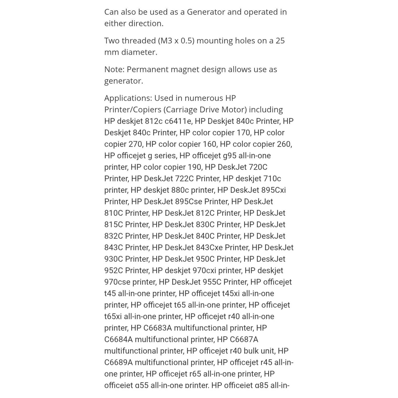 طبق عکس موجود کاملا سالم و تست شده و بدون صدا و مشکل روتور ، اسپید موتور 6 تا 18 ولت دارای دور معکوس ، 3500 دور و 100mA در حالت بدون بار ، 1753 دور و 1.37A در حالت بار حداکثر و توان مصرفی 11.47 وات ، قطر 3.5cm × طول 5.5cm ،