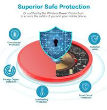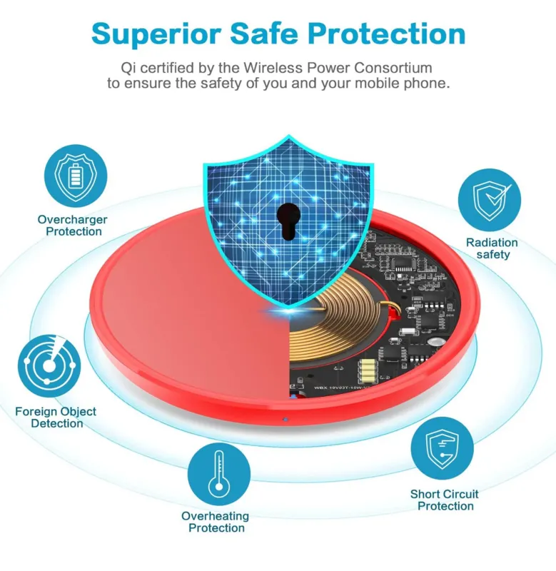 ایمنتر و آسانتر برای استفاده فناوری انحصاری حفاظت هوشمند چند منظوره کنترل دما، حفاظت از نوسانات، جلوگیری از اتصال کوتاه را فراهم میکند. علاوه بر این، این شارژر بی سیم دارای گواهی Qi، ساخته شده از مواد ABS است که در برابر آتش مقاوم است و دارای گواهینامه