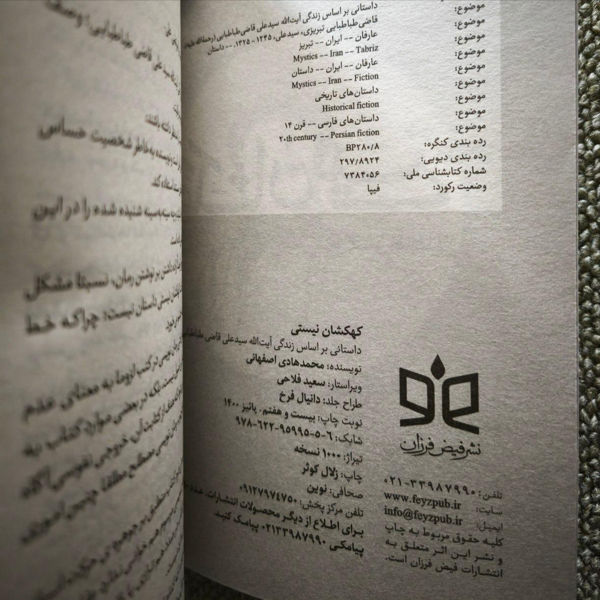 کتاب کهکشان نیستی، داستانی بر اساس زندگی آیت ا... سید علی قاضی طباطبایی. کتاب نو هست ولی به خاطر یکی دو بار مطالعه و صرفاً یکی از ورق های انتهایی کتاب که حدود دو سانتیمتر پارگی داره کیفیت درحد ذکر شده است.