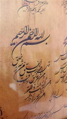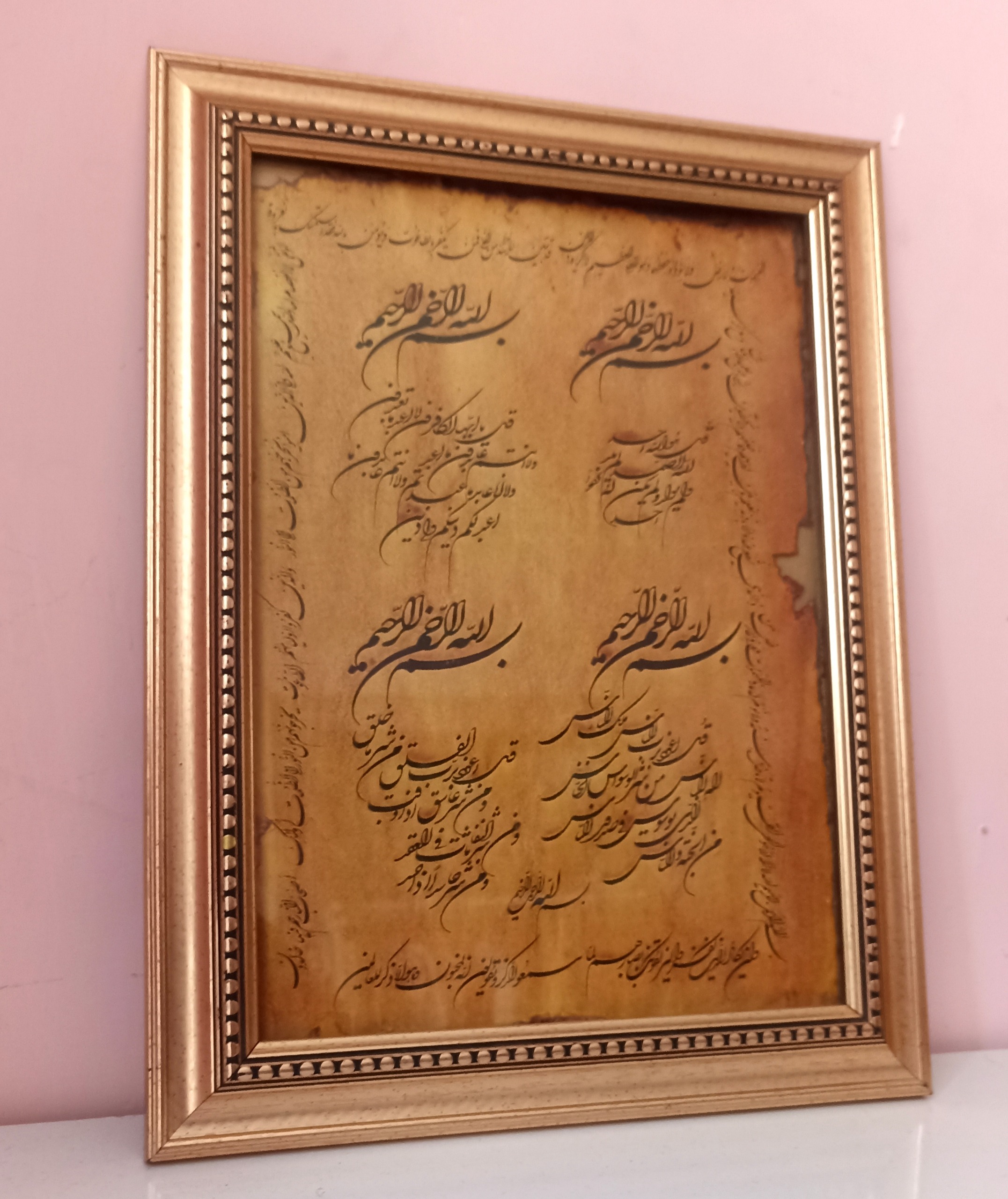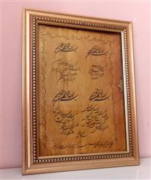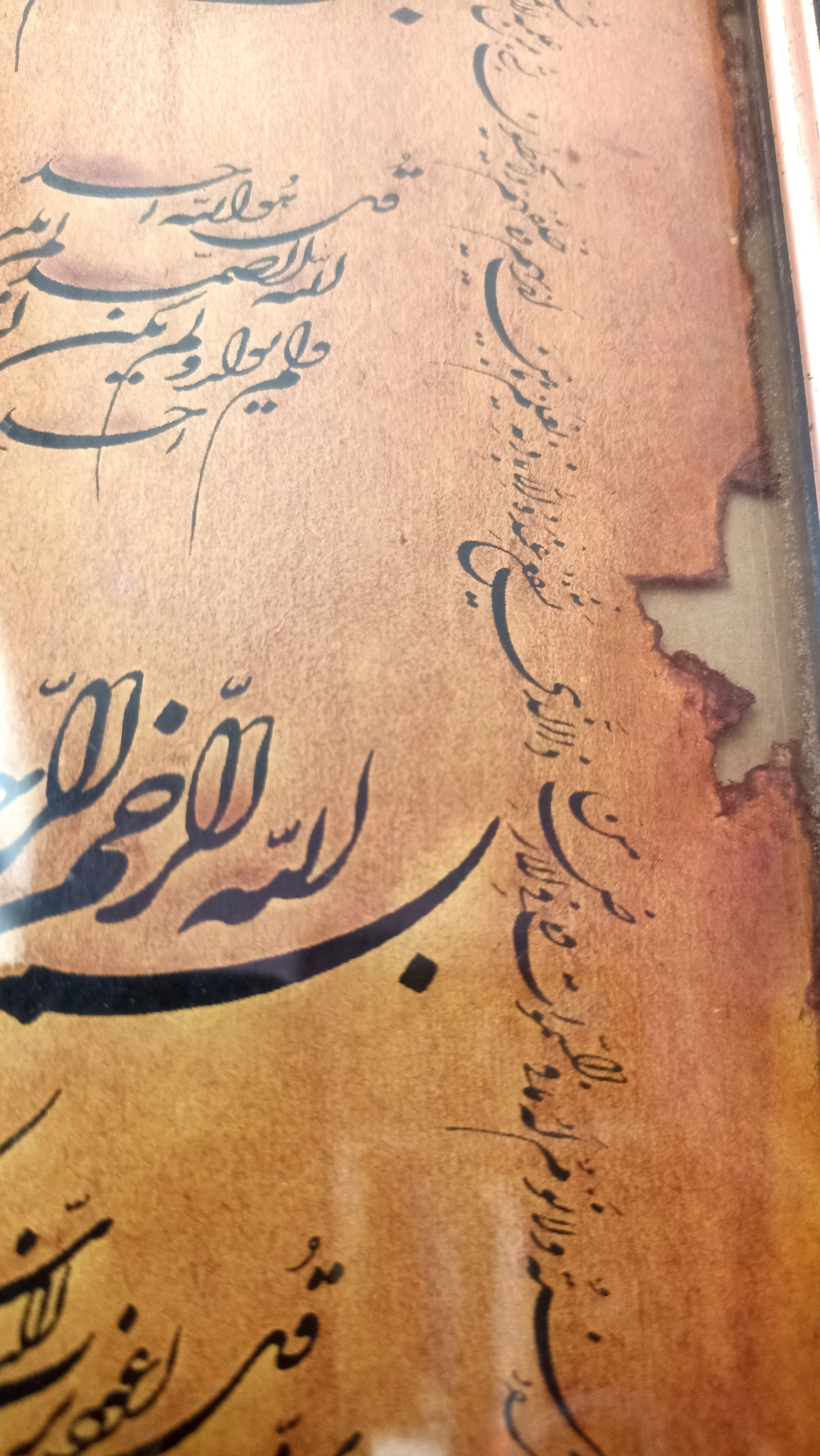 خطاطی زیبا بر روی پوست با آیات مبارکه چهار قل و دور تا دور وان یکاد