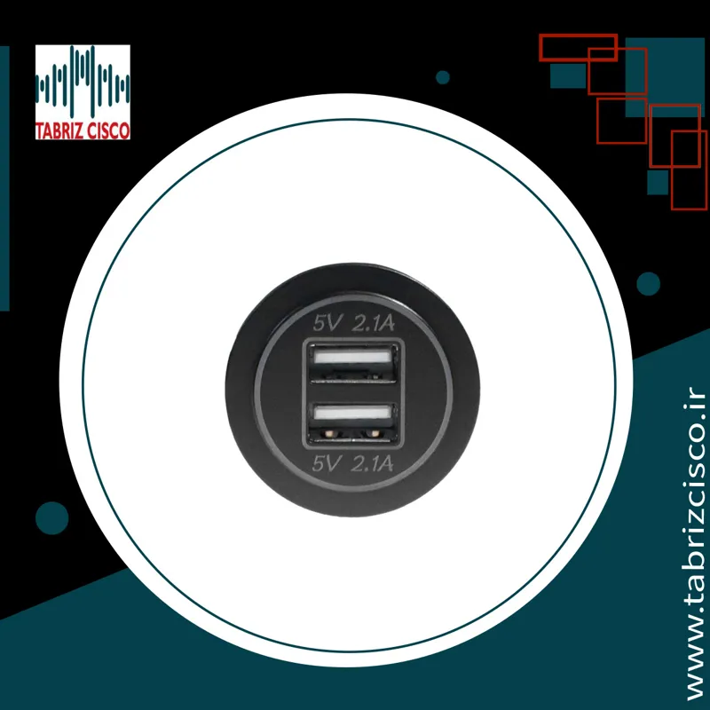 ماژول شارژر USB روپنلی گرد دارای دو خروجی 2.1 آمپر (جریان بالا) با ورودی 12 الی 24 ولت DC مناسب نصب روی انواع خودرو یا پنل