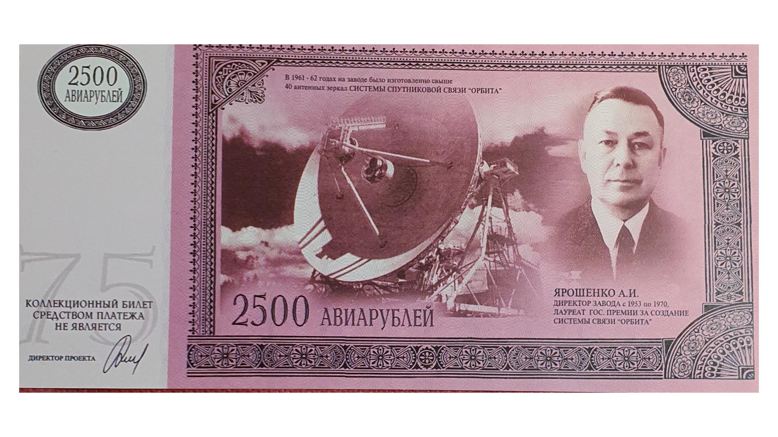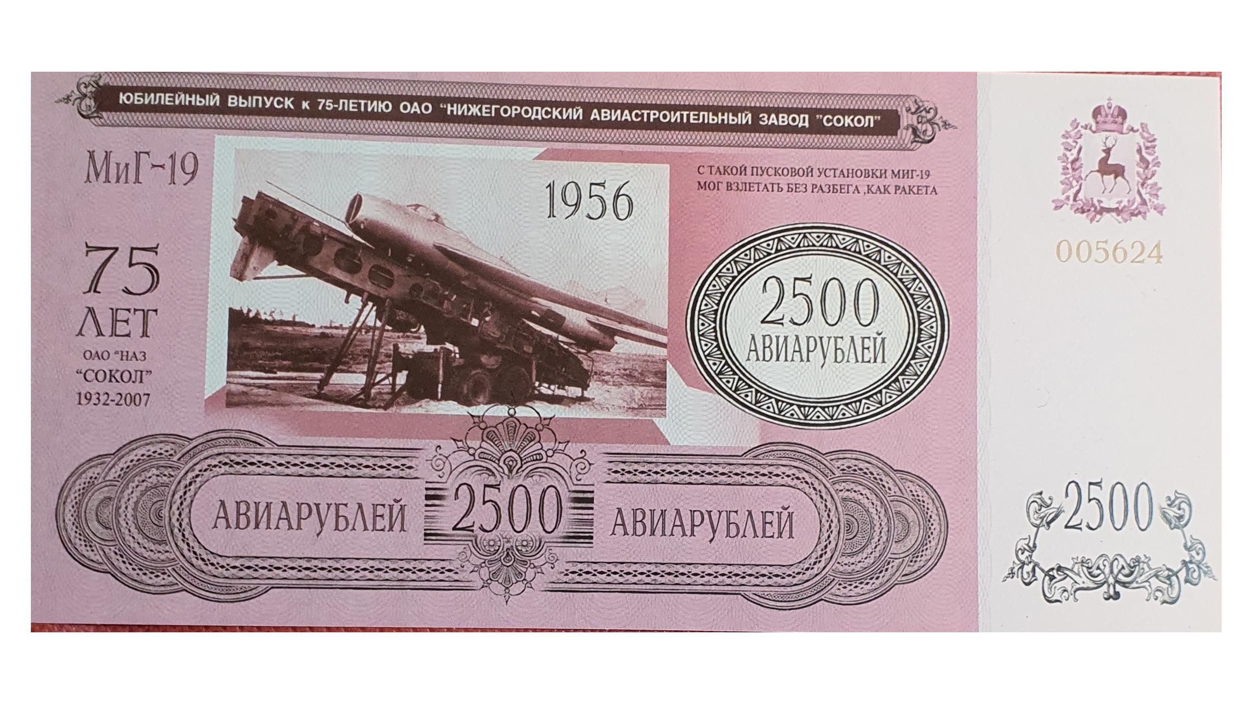 کیفیت و سریال اسکناس نایاب یادبود کلکسیونی یادگاری و کلاسیک آویا روبل نمادین مطابق عکس به مناسبت هفتاد و پنجمین سالگرد تأسیس کارخانه هواپیماسازی نیژنی نووگورود سوکول (سال های فعالیت 1932 - 2007) مرتبط با صنعت هوا و فضا و نمایشگاه هوایی با تصاویری از صنایع نظامی و هوایی اتحاد جماهیر شوروی مزین به هواپیماهای جنگی نظیر میگ ها با مشخصات فنی کاغذ مخصوص چاپ یادبود در ابعاد اسکناس های بزرگ یادبودی و چاپ افست کلکسیونی و شماره سریال اختصاصی در سال 2007 میلادی انتشار یافته است و ارتباط مستقیم با صنعت هوا فضای روسیه دارد و هدیه ای جذاب و تاریخی برای علاقه مندان هوانوردی به حساب می آید و هر قطعه این اسکناس ها در بازار کلکسیون و سایت های معتبر خارجی بستگی به کیفیت ، بین 10 تا 50 دلار ارزش دارد .