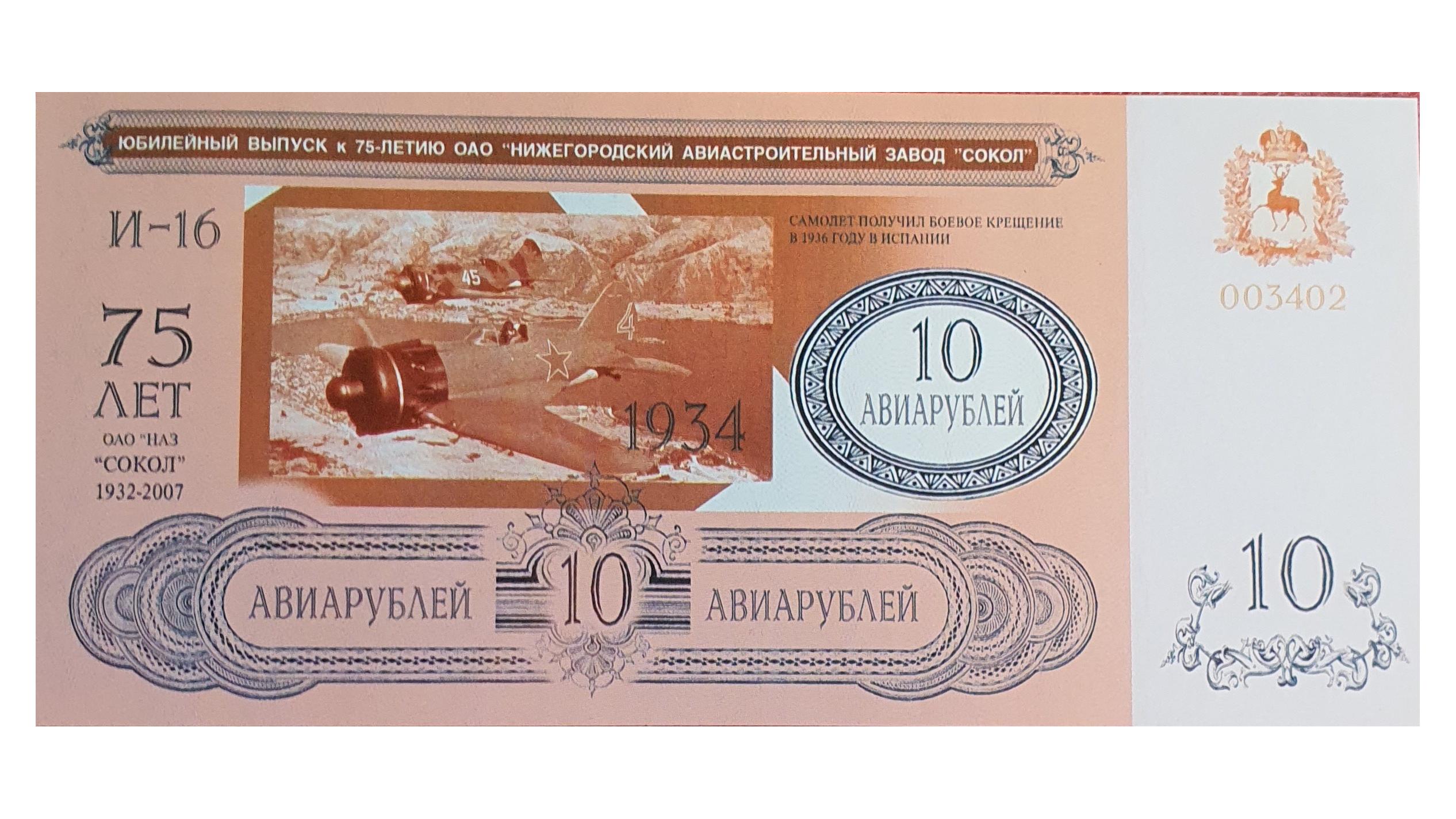 کیفیت و سریال اسکناس نایاب یادبود کلکسیونی یادگاری و کلاسیک آویا روبل نمادین مطابق عکس به مناسبت هفتاد و پنجمین سالگرد تأسیس کارخانه هواپیماسازی نیژنی نووگورود سوکول (سال های فعالیت 1932 - 2007) مرتبط با صنعت هوا و فضا و نمایشگاه هوایی با تصاویری از صنایع نظامی و هوایی اتحاد جماهیر شوروی مزین به هواپیماهای جنگی نظیر میگ ها با مشخصات فنی کاغذ مخصوص چاپ یادبود در ابعاد اسکناس های بزرگ یادبودی و چاپ افست کلکسیونی و شماره سریال اختصاصی در سال 2007 میلادی انتشار یافته است و ارتباط مستقیم با صنعت هوا فضای روسیه دارد و هدیه ای جذاب و تاریخی برای علاقه مندان هوانوردی به حساب می آید و هر قطعه این اسکناس ها در بازار کلکسیون و سایت های معتبر خارجی بستگی به کیفیت ، بین 10 تا 50 دلار ارزش دارد .