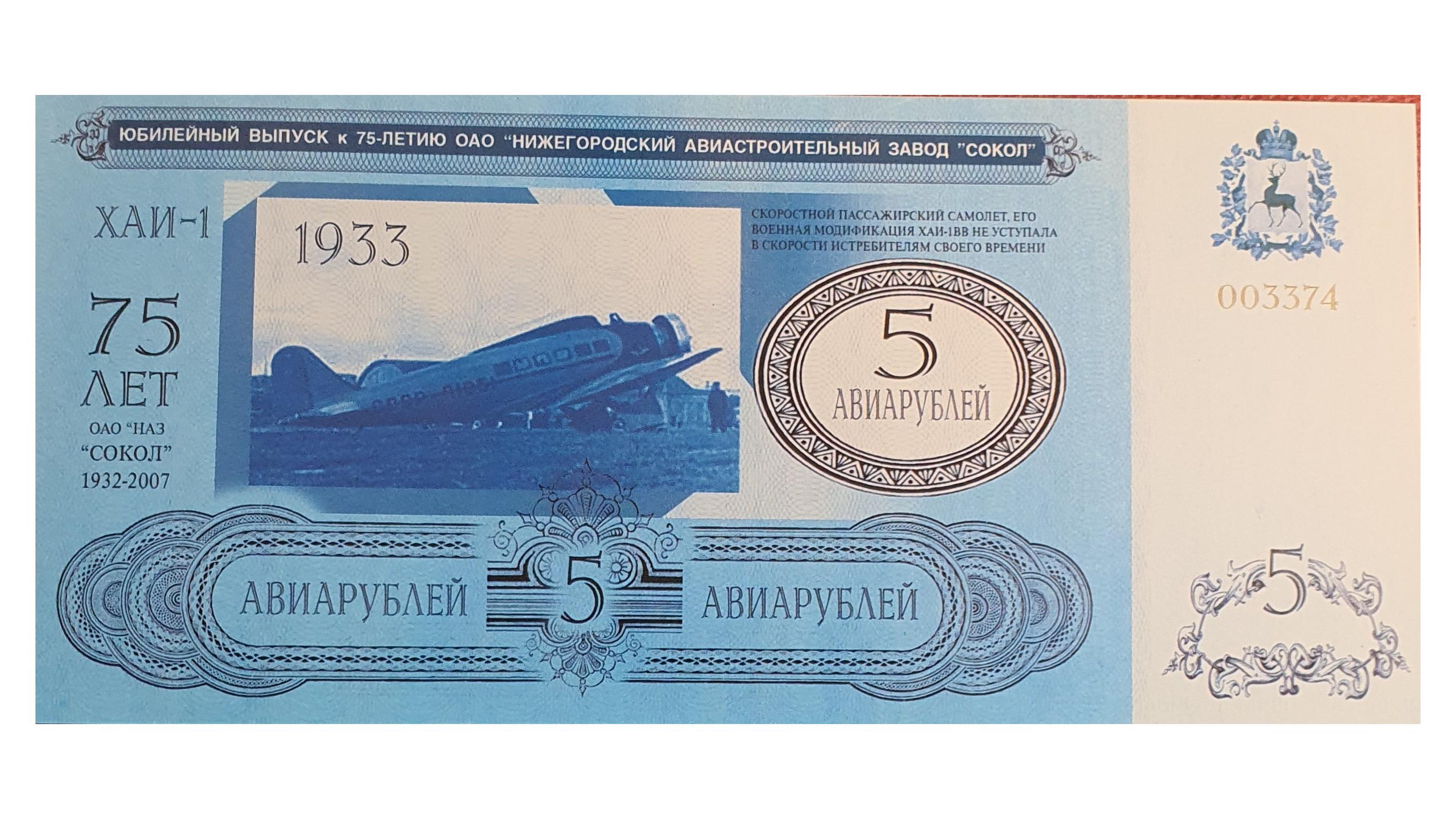 کیفیت و سریال اسکناس نایاب یادبود کلکسیونی یادگاری و کلاسیک آویا روبل نمادین مطابق عکس به مناسبت هفتاد و پنجمین سالگرد تأسیس کارخانه هواپیماسازی نیژنی نووگورود سوکول (سال های فعالیت 1932 - 2007) مرتبط با صنعت هوا و فضا و نمایشگاه هوایی با تصاویری از صنایع نظامی و هوایی اتحاد جماهیر شوروی مزین به هواپیماهای جنگی نظیر میگ ها با مشخصات فنی کاغذ مخصوص چاپ یادبود در ابعاد اسکناس های بزرگ یادبودی و چاپ افست کلکسیونی و شماره سریال اختصاصی در سال 2007 میلادی انتشار یافته است و ارتباط مستقیم با صنعت هوا فضای روسیه دارد و هدیه ای جذاب و تاریخی برای علاقه مندان هوانوردی به حساب می آید و هر قطعه این اسکناس ها در بازار کلکسیون و سایت های معتبر خارجی بستگی به کیفیت ، بین 10 تا 50 دلار ارزش دارد .