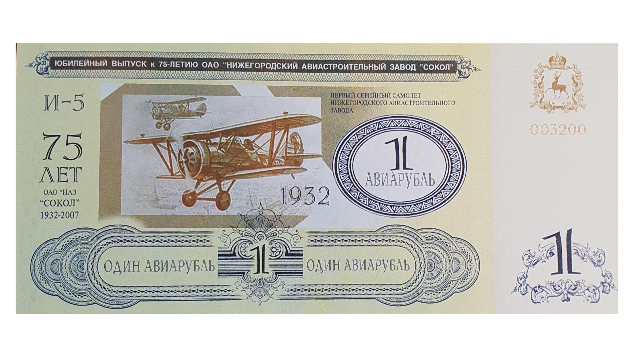 کیفیت و سریال اسکناس نایاب یادبود کلکسیونی یادگاری و کلاسیک آویا روبل نمادین مطابق عکس به مناسبت هفتاد و پنجمین سالگرد تأسیس کارخانه هواپیماسازی نیژنی نووگورود سوکول (سال های فعالیت 1932 - 2007) مرتبط با صنعت هوا و فضا و نمایشگاه هوایی با تصاویری از صنایع نظامی و هوایی اتحاد جماهیر شوروی مزین به هواپیماهای جنگی نظیر میگ ها با مشخصات فنی کاغذ مخصوص چاپ یادبود در ابعاد اسکناس های بزرگ یادبودی و چاپ افست کلکسیونی و شماره سریال اختصاصی در سال 2007 میلادی انتشار یافته است و ارتباط مستقیم با صنعت هوا فضای روسیه دارد و هدیه ای جذاب و تاریخی برای علاقه مندان هوانوردی به حساب می آید و هر قطعه این اسکناس ها در بازار کلکسیون و سایت های معتبر خارجی بستگی به کیفیت ، بین 10 تا 50 دلار ارزش دارد .
