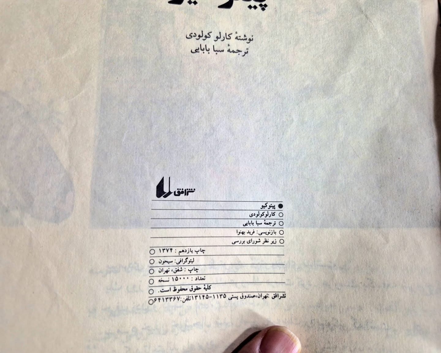 چاپ 74 ، نشر افق، اثر کارلو کلودی، مصور رنگی، 24 صفحه بسیااااااار باکیفیت و تمیز و سالم بدون مهر و یادگاری و خط خوردگی در حد نو