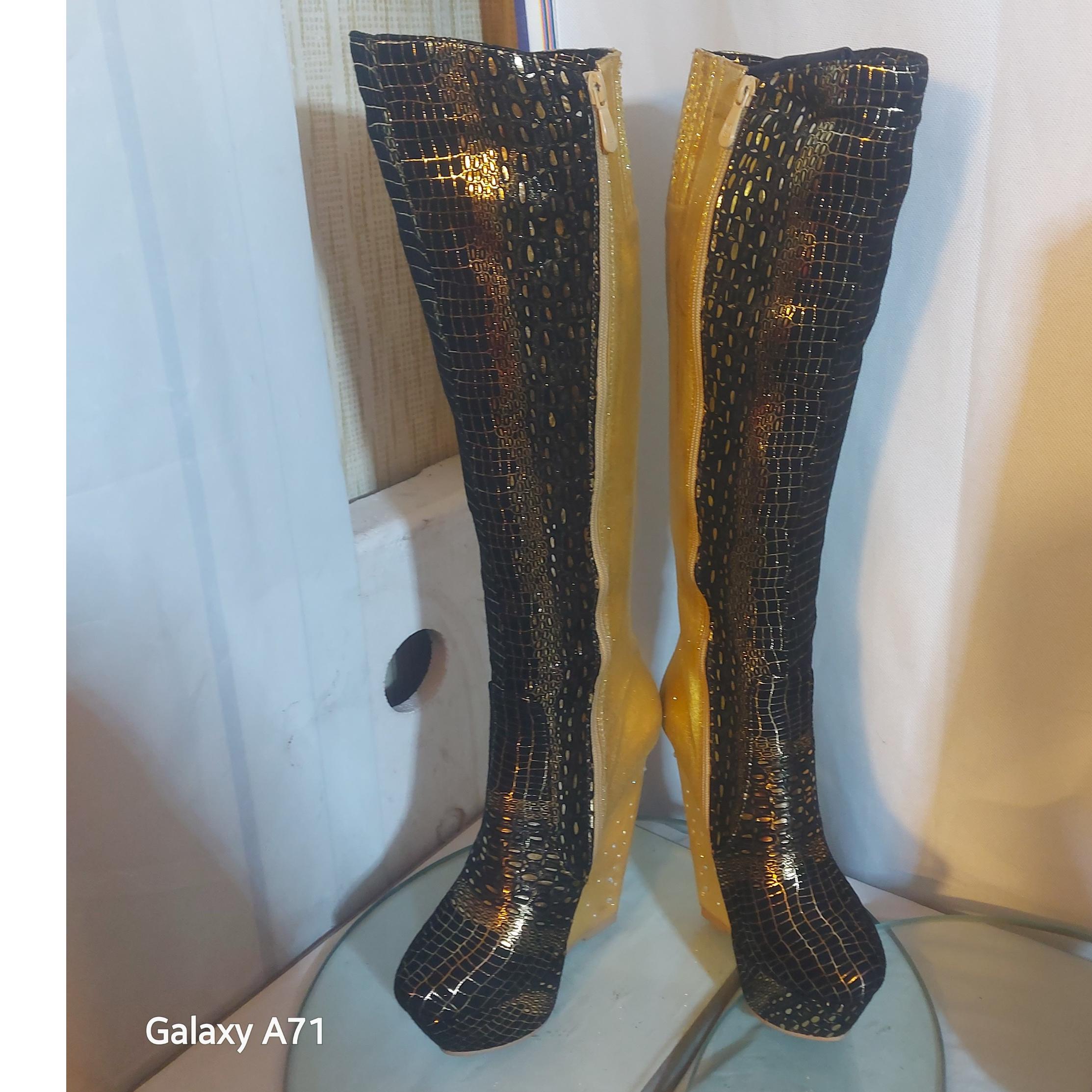 توجه کنید دوجفت که پاشنه بلند حدود 15 سانت میباشد رنگ قهوهای چرمی و مشکی طلایی یکبار فقط در میهمانی پوشیده شده و با کفش نو تفاوتی ندارد. دو جفت پاشنه کوتاه کرم رنگ بوت و پاشنه 5 سانت اسپرت که بندی و زیپی و زبانه مرواریددوزی هست صددرصد نو و اصلا پوشیده نشده.