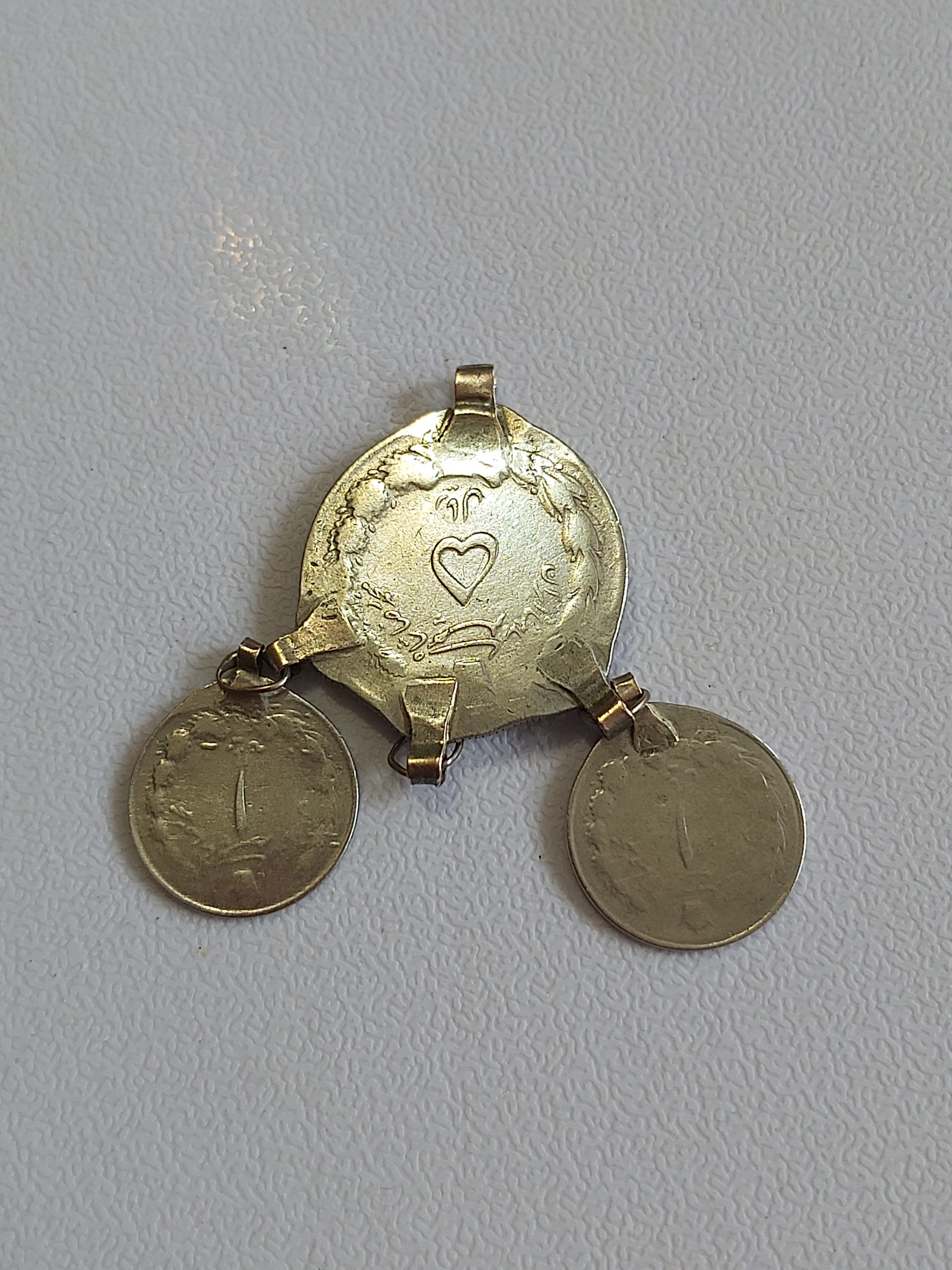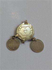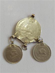 سلامسکه پنج ریال آویز دار متصل به دوسکه یک ریالی..جهت اتصال به لباس یا زیر روسری محلی در کل تزئین کردن در لباس محلی(لری و ترکی)