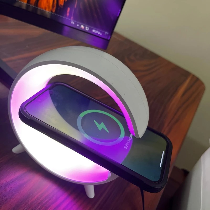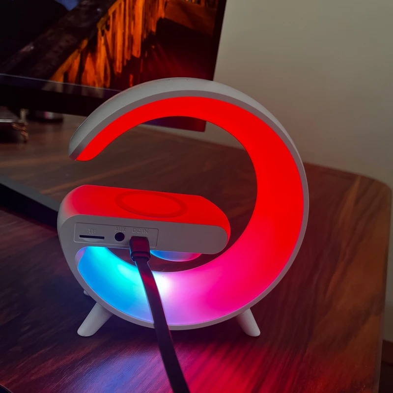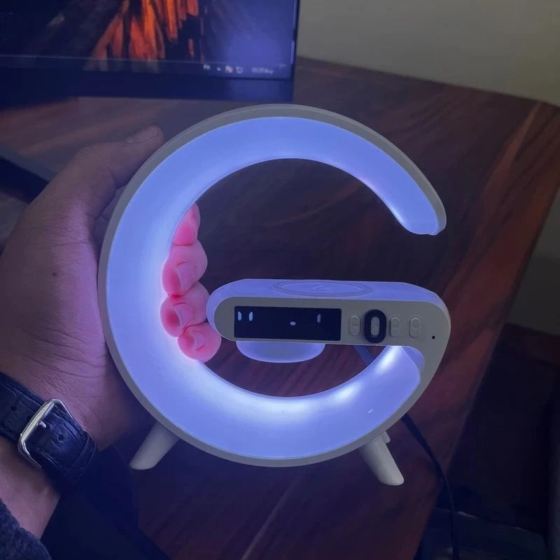 چراغ خواب هوشمند RGB مدل G63 طرح اسپیکر دار ، یک گجت چندکاره است که علاوه بر یک چراغ خواب جذاب با افکت های نوری RGB ، قابلیت نمایش ساعت و تنظیم ساعت بیدار شدن و کوک کردن ساعت و همچنین قابلیت شارژ کردن وایرلس موبایل را دارد . از قابلیت جذاب دیگه این محصول که آن را خاص میکند ، اسپیکر های این چراغ خواب است که میتوانید قبل از خواب موزیک دلخواه خودتون رو از طریق بلوتوث پخش کنید. برای تنظیم ساعت این دستگاه کافیه یکبار به یک تلفن همراه (از طریق بلوتوث) متصل کنید تا ساعت دستگاه تنظیم شود . این دستگاه برای روشن شدن نیاز به آداپتور 20 وات دارد که میتوانید از آداپتور های موبایل این وسیله را شارژ و یا روشن کنید
