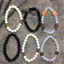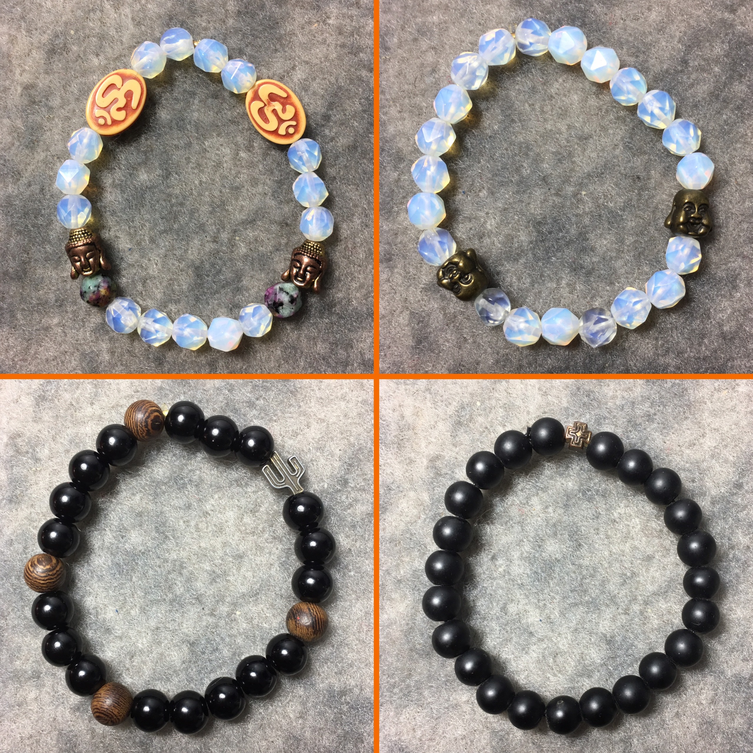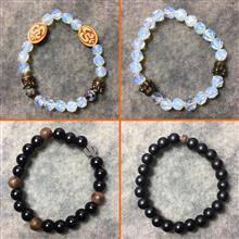 توجه کنید که مهره ها عمدتاً غیرسنگی (رزینی و شیشه ای) هستند و در بعضی دستبند ها تعداد محدودی مهره سنگ تزئینی به کار رفته است.