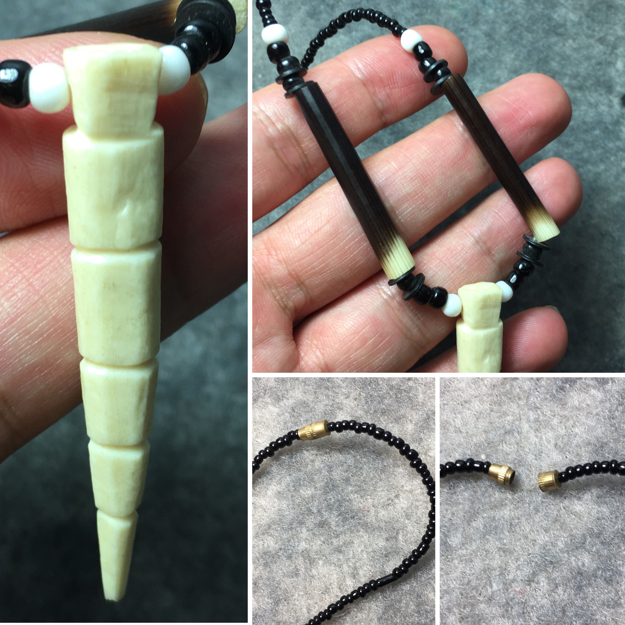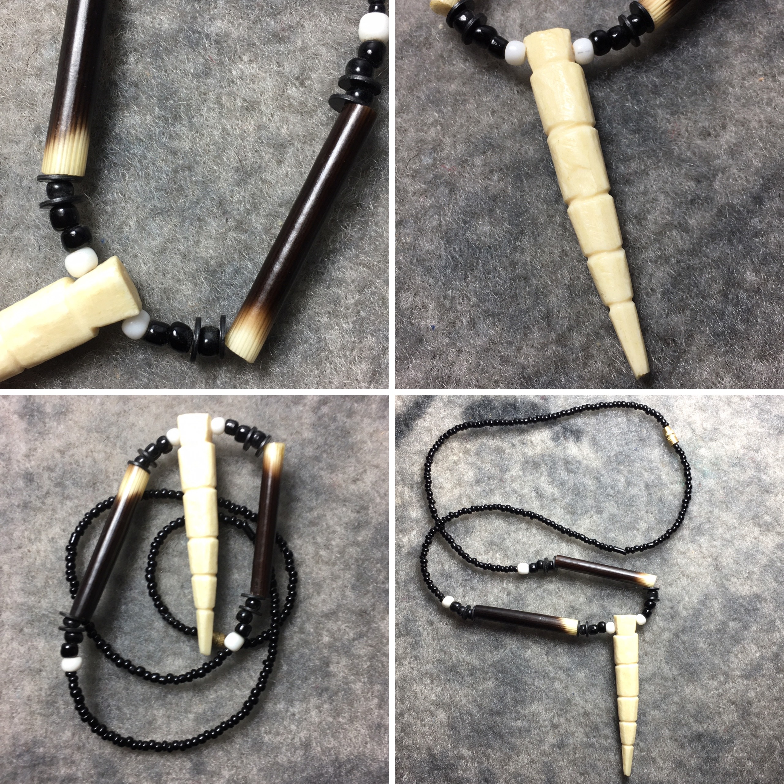 ترکیب مهره های ریز مشکی و سفید به همراه قطعات تیغ و یک آویز عاج سفید رنگ با فرم خاص.
