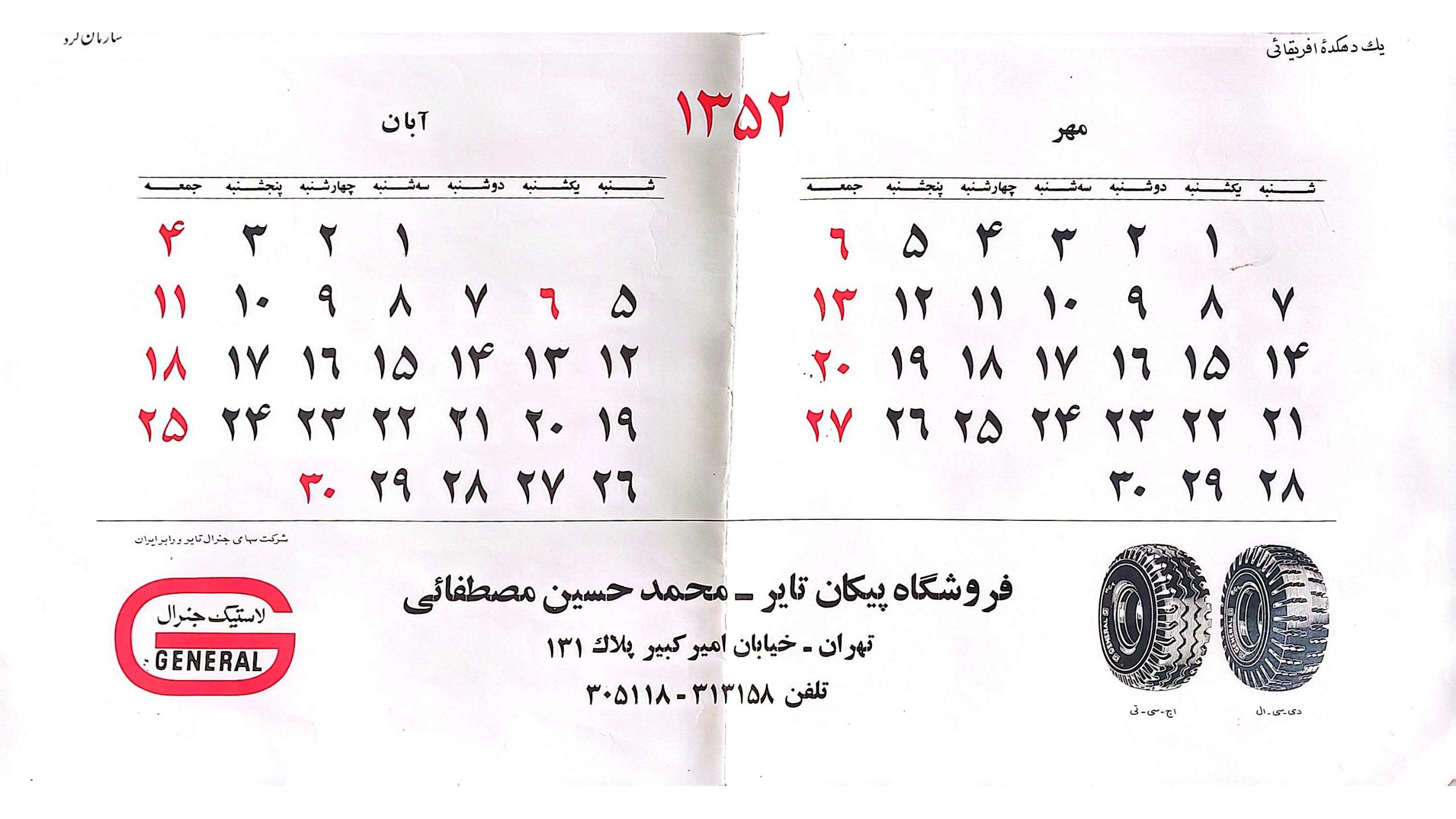تقویم تبلیغاتی جهان تایر و رابر تایر پهلوی