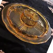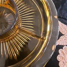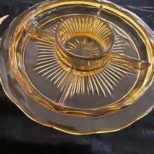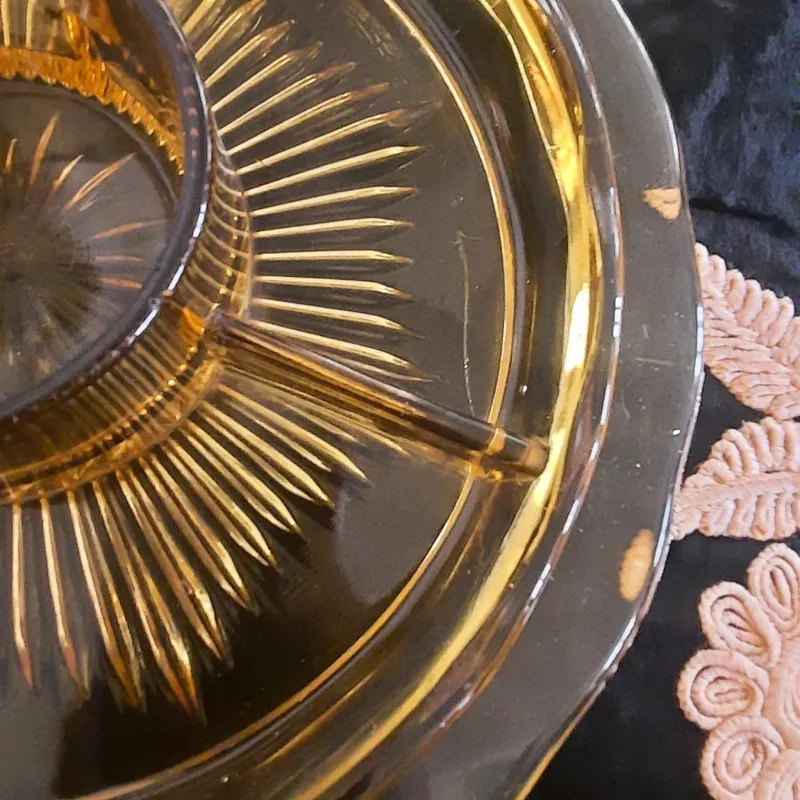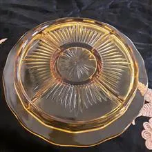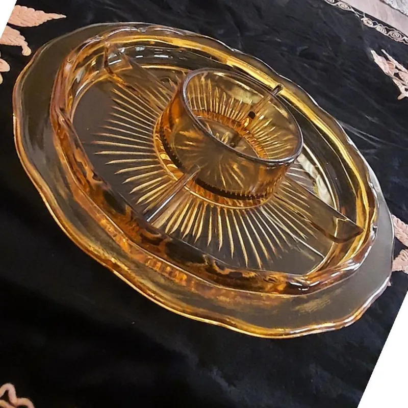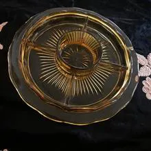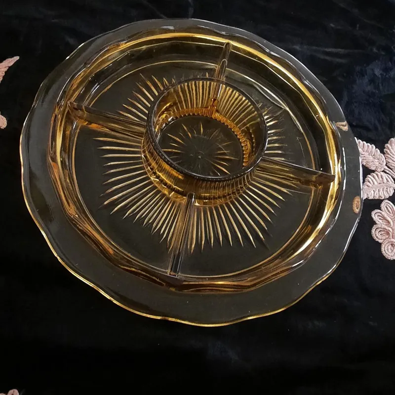 یک عدد شیرینی خوری یا اردورخوری کریستال چک عسلی نایاب سنگین پنج قسمت قطر کل 25 و نیم قطر داخلی 21 قطر دایره کوچک 8 عمق 4 و عمق چهار تا تقسیم 3 سانت توجه کنید یک خط 5 سانتی در یکی از تقسیمها دارد حباب ریز در کل کار دارد و دو خط در دور خارجی دیده میشود دور تا دور لبه خارجی چهار تا لبپری میلیمتری دارد در کل بسیار زیبا کلکسیونی و کاربردی