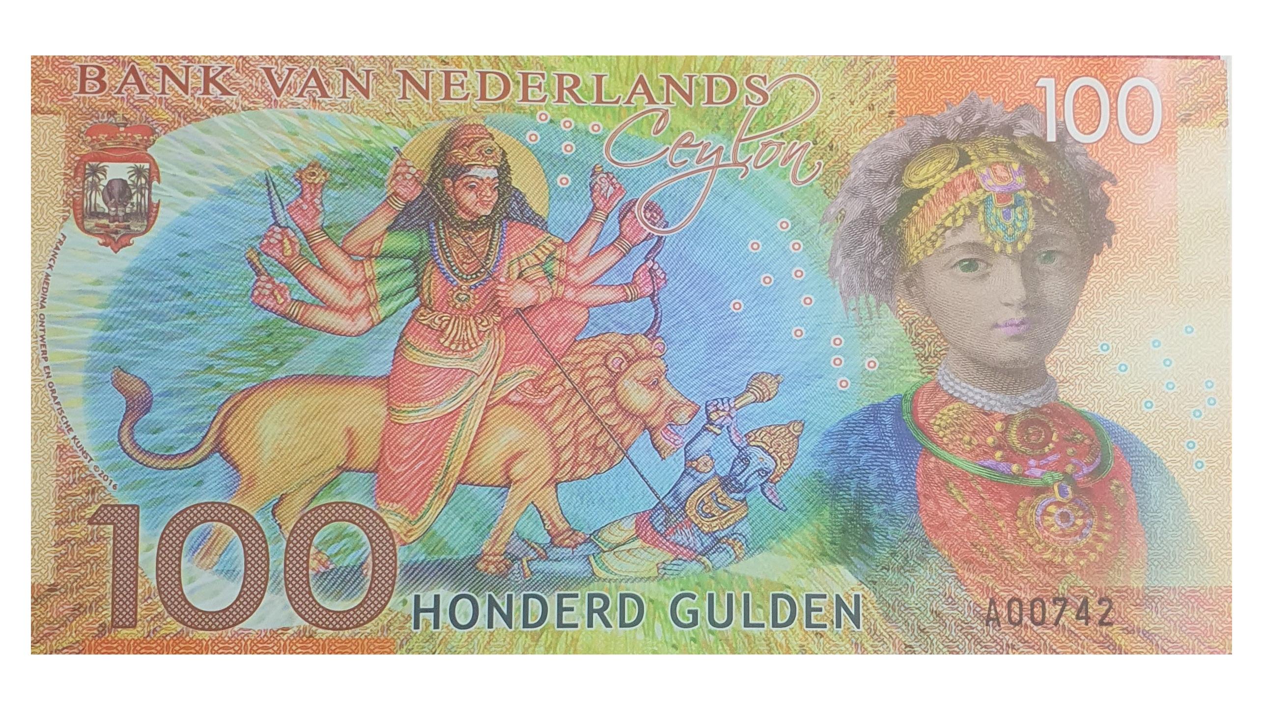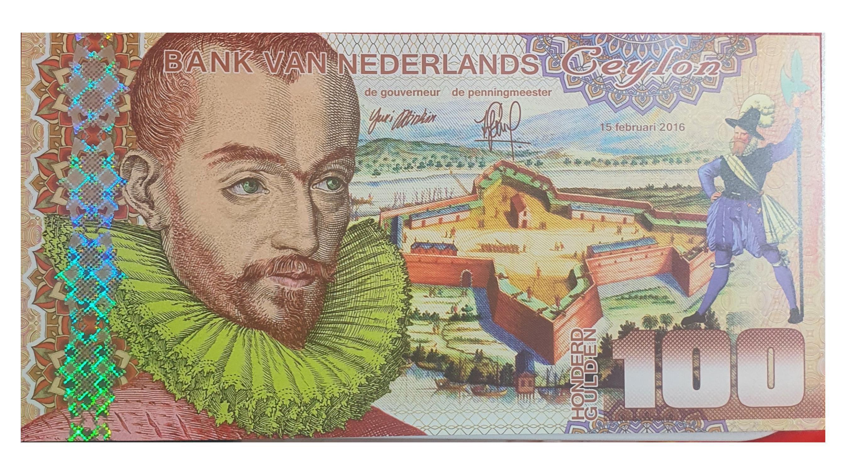 کیفیت و سریال اسکناس نایاب پلیمر فانتزی در ابعاد 83 × 165 میلی متر با الهام از دروان حکومت هلند بر جزیره سیلان یا سریلانکای فعلی مزین به پرتره مرد اروپایی ، قلعه استعماری هلندی ، سرباز هلندی ، الهه هندو سوار بر شیر ، چهره زن سنتی سیلان و عناصر امنیتی هولوگرام و چاپ رنگی زیبا در سال 2016 چاپ شده است و هدیه ای جذاب و تاریخی برای کلکسیونرها و مجموعه داران به حساب می آید و هر قطعه این اسکناس در بازار نوستالژی کلکسیون و سایت های آنلاین معتبر خارجی 20 دلار ارزش دارد .